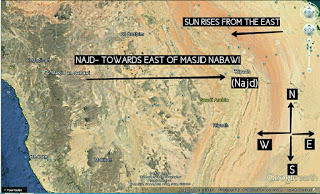 Even the briefest glimpse at a modern atlas will show that a straight line drawn to the east of al-Madina al-Munawwara does not pass anywhere near Iraq, but passes some distance to the south of Riyadh; that is to say, through the exact centre of Najd. The hadiths which speak of ‘the East’ in this context hence support the view that Najd is indicated, not Iraq.
