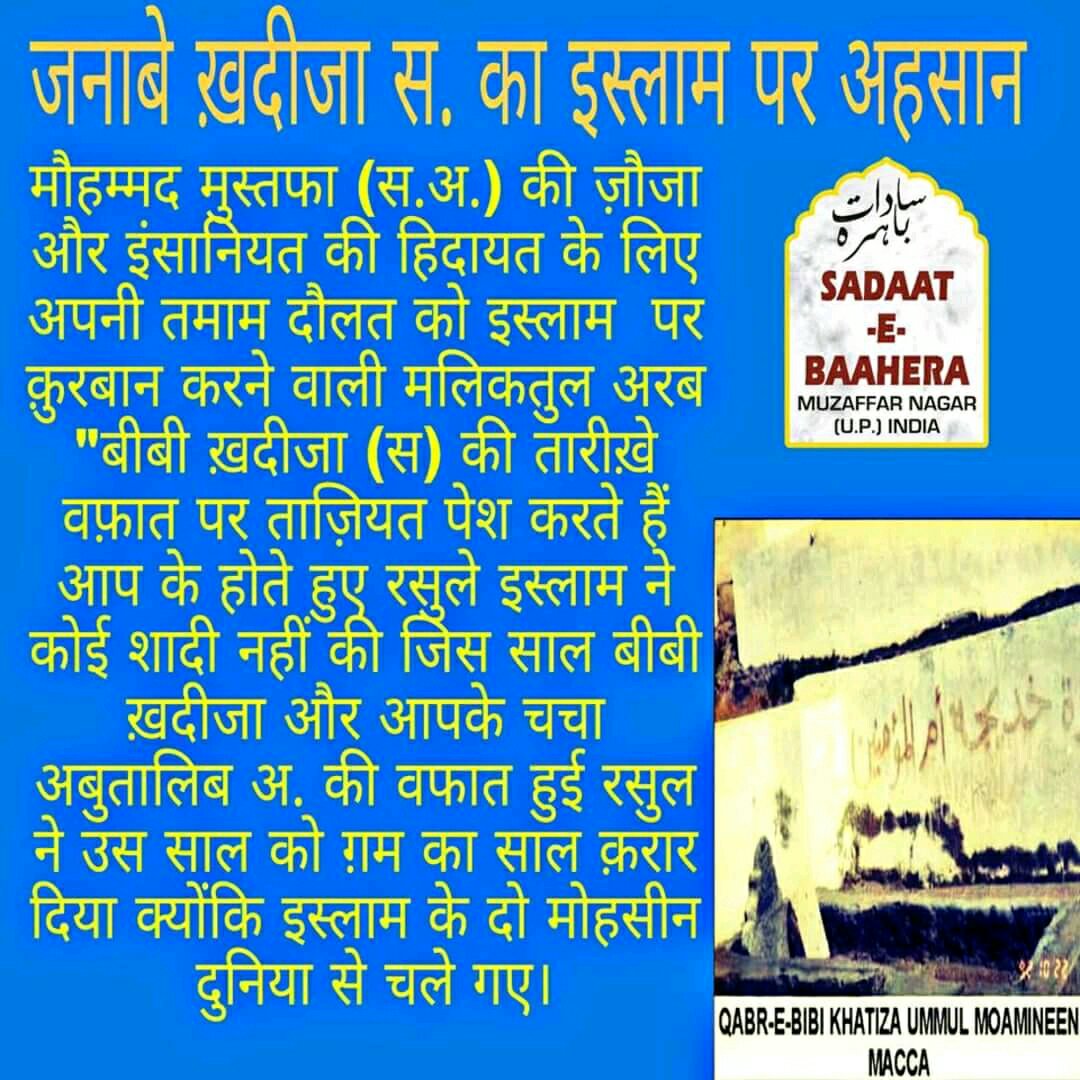 Aap سلام الله عليها Huzoor Paakﷺ ki sab se pehli zauja hai apne sab se pehle aurto me islam qubool kiya aap ke hote hue Huzoor Paakﷺ ne kisi dusri aurat se nikah nahi farmaya Huzoor Paakﷺ ke 3 Shehzade aur 4 Shehzadiya thi siwae 1 shahzade ke sabhi aulad Hazrat Khadija سلام الله عليها se hi hui Aap ka wisaal hijrat ke takriban 3 saal pehle hogaya tha..