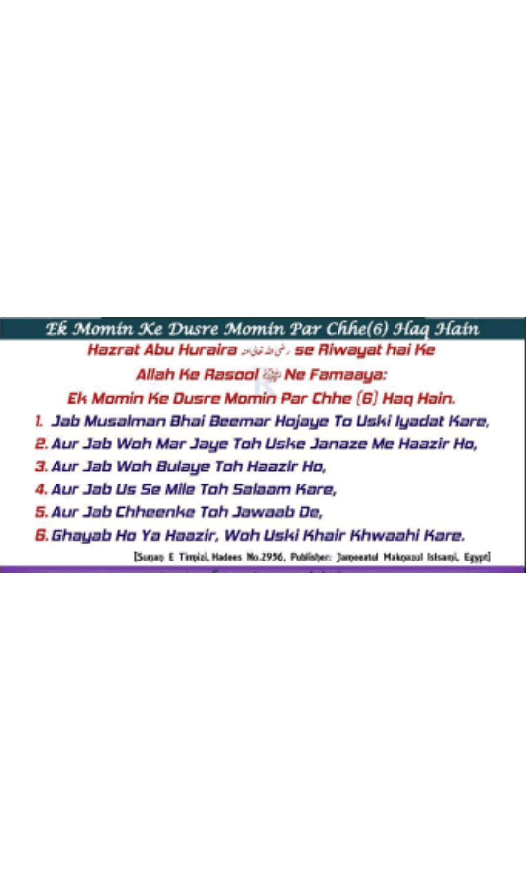 Hadith ek momin ke dusre momin per 6 Haq hain June 25, 2020June 25, 2020 aal-e-qutub Share this: Click to share on X (Opens in new window) X Click to share on Facebook (Opens in new window) Facebook Click to print (Opens in new window) Print Click to share on Pinterest (Opens in new window) Pinterest Click to share on WhatsApp (Opens in new window) WhatsApp Like Loading... Related Published by aal-e-qutub View all posts by aal-e-qutub