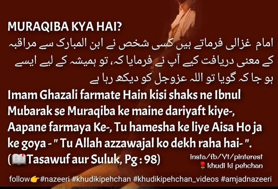 *Imam Ghazali farmate Hain kisi shaks ne Ibnul Mubarak se Muraqiba ke maine dariyaft kiye-, Aapane farmaya Ke-, Tu hamesha ke liye Aisa Ho ja ke goya – ” Tu Allah azzawajal ko dekh raha hai- “.*