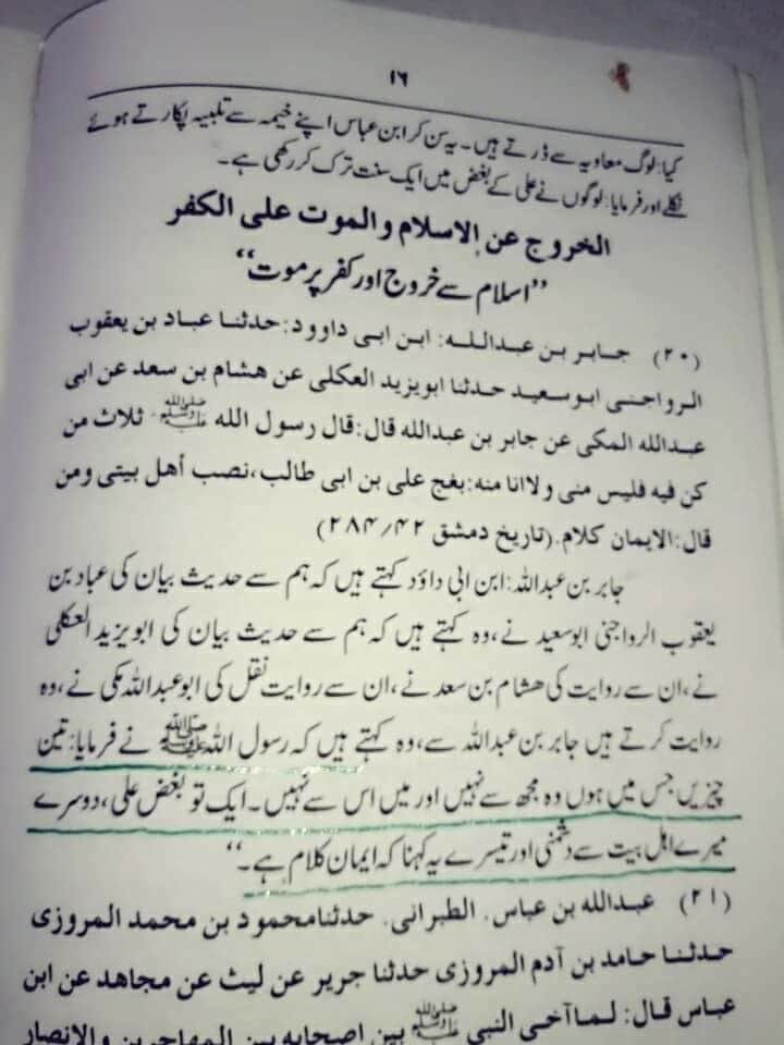 * हदीस ए पाक जाबिर बिन अब्दुल्लाह रदिअल्लाहो अन्हो से रिवायत है के हुज़ूर नबी ए अकरम सल्लल्लाहो अलैहे वा आलेही वा सल्लम ने इरशाद फ़रमाया 👇👇👇👇👇 तीन चीज़े जिस में हों वो मुझसे नही और मैं उससे नही 1- अली से बुग्ज़ 2- मेरे अहलेबैत से दुश्मनी 3- ये कहना के ईमान कलाम है हवाला 📚📚 तारीख़ ए दमिश्क़ 42/274