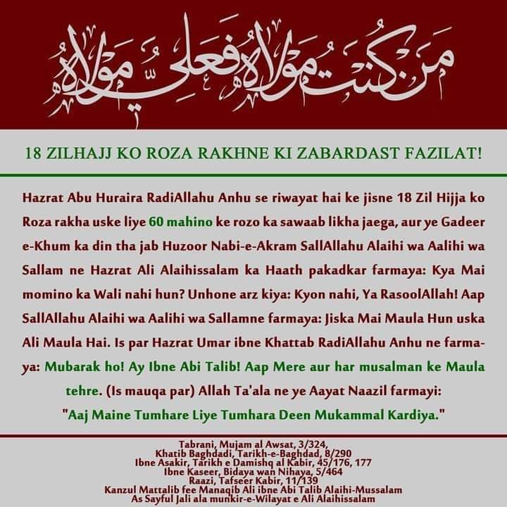 Hazrat Abu Huraira RadiAllahu Anhu se riwayat hai ke jisne 18 Zil Hijja ko Roza rakha uske liye 60 mahino ke rozo ka sawaab likha jaega, aur ye Gadeer-e-Khum ka din tha jab Huzoor Nabi-e-Akram SallAllahu Alaihi wa Aalihi wa Sallam ne Hazrat Ali Alaihissalam ka Haath pakadkar farmaya: Kya Mai momino ka Wali nahi hun? Unhone arz kiya: Kyon nahi, Ya RasoolAllah! Aap SallAllahu Alaihi wa Aalihi wa Sallamne farmaya: Jiska Mai Maula Hun uska Ali Maula Hai. Is par Hazrat Umar ibne Khattab RadiAllahu Anhu ne farmaya: Mubarak ho! Ay Ibne Abi Talib! Aap Mere aur har musalman ke Maula tehre. (Is mauqa par) Allah Ta’ala ne ye Aayat Naazil farmayi: “Aaj Maine Tumhare Liye Tumhara Deen Mukammal Kardiya.”