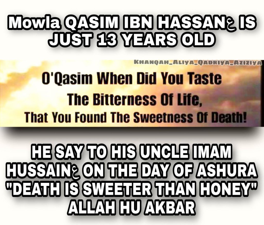 🌹क़ासिम बिन हसन की शहादत : हज़रत क़ासिम इमाम हुसैन अलैहिस्सलाम के बड़े भाई इमाम हसन के बेटे थे । उस समय उनकी उम्र लगभग तेरह साल थी I रोज़े आशुर चचा हुसैन के पास आये और कहा बाबा हसन ने मेरे बाजू में एक तावीज़ बाँधा था और कहा था बेटे जब कभी सख्त परेशानी आ जाये तो इस तावीज़ को खोलकर अपनी आँखों से लगा लेंना I मैंने इस तावीज़ को आज जब खोल कर देखा तो उस पर लिखा था की भाई हुसैन के साथ तुम्हे भी दींन की हिफाज़त करने जाना पड़ा तो उनसे पहले तुम्हें अपनी कुर्बानी देनी होगी, लिहाज़ा चचाजान ये बाबा का हुक्म है मुझे आप यज़ीदी सिपाहियों का सामना करने जाने दे, आपने कहा “ अए बेटे तुम मेरे भाई हसन की निशानी और वारिस हो अभी तुम बहोत छोटे भी हो तुम्हे मै जंग में जाने की इजाज़त भला किस तरह से दे सकता हूँ तुम्हें देखता हूँ तो मुझे भाई हसन नज़र आते है तुम्हारे चेहरे को देखता हूँ तो नाना जान का नूरानी जलवा नज़र आता है । मगर आपने जवाब दिया चचाजान मेरी रगों में बाबा हसन और दादा अली का खून है, ये तो मेरी खुशकिस्मती है की कम उम्र में ही मुझे जंग करने का मौका मिला है । आप मुझे इजाज़त दे I और फिर इमामे आली मकाम हुसैन अलैहिस्सलाम से इजाज़त लेकर जब ये शेर यज़ीदी फौज मे गया तो इस शेर की तलवार के जौहर से यज़ीदी पीछे हट गए, इतनी कम उम्र में भी हज़रत क़ासिम ने इतनी हिम्मत और बहादुरी से लड़ाई लड़ी कि यज़ीदी फ़ौज के बड़े बड़े सूरमाओं के भी छक्के छूट गए. क़ासिम की बहादुरी देख कर अम्र बिन साअद जैसे बड़े पहलवान को हज़रत क़ासिम के सामने आना पड़ा जिसके बारे में ये मशहूर था की वो एक हज़ार की फौज पर अकेले ही काबू पा सकता था और इस बदबख्त ने हज़रत क़ासिम के सर पर तलवार मार कर उन्हें शहीद कर दिया ((इन्ना लिल्लाहि व इन्ना इलैही राजेउन)) 😭😭😭😭😭😭😭😭 HASSANع KA LAL ZEEN PAE THA THO QASIMع THA ZAMIN MAE AYA THO TAQSEEM HOGYA HAYE… EK GATHRI MAE PAMAL QASIMع HOGYA…
