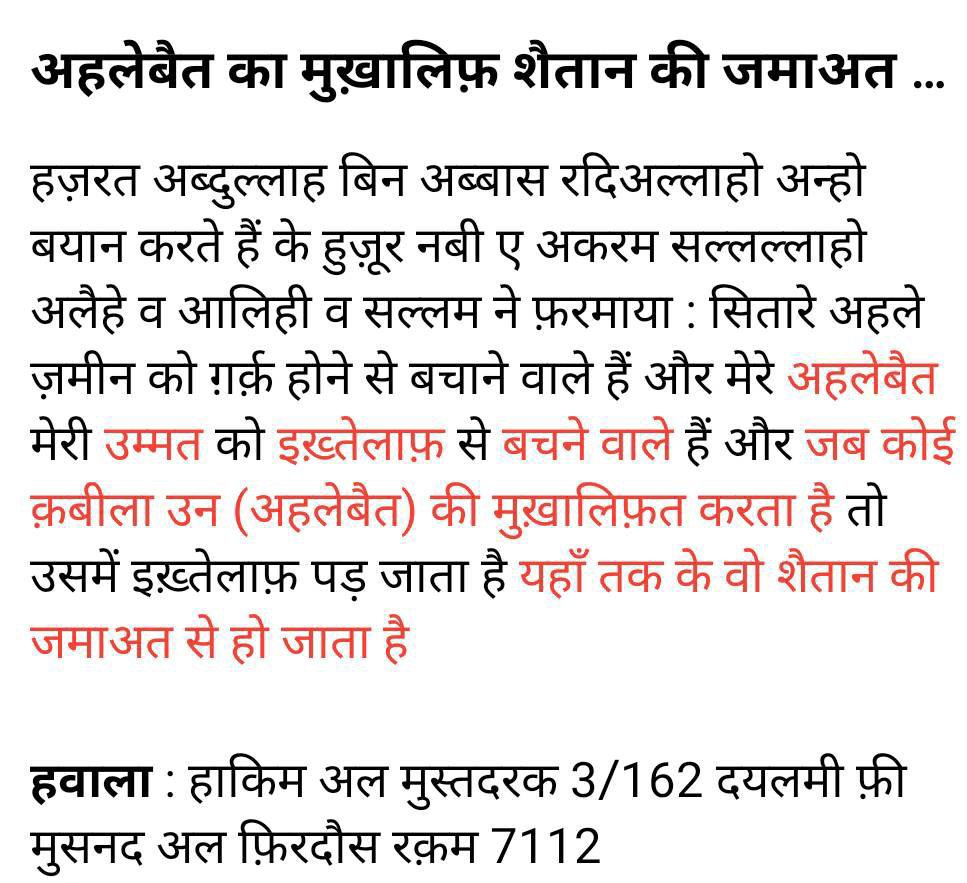 Hadith on Ahele bayt Mukhalif Shaitan ki jammat