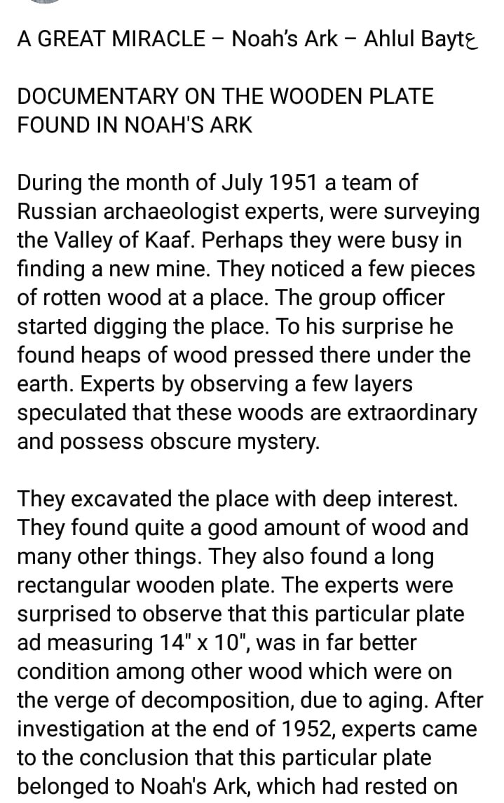 So these seven experts after eight months of research come to the conclusion that this plate was of the wood used in making Noah’s Ark and that the Prophet Noah had put this plate on his Ark for the safety of the Ark and for receiving favor of God.