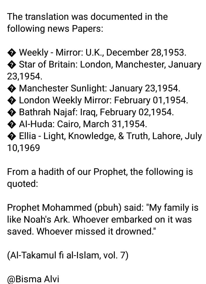 Prophet Mohammed (pbuh) said: “My family is like Noah’s Ark. Whoever embarked on it was saved. Whoever missed it drowned.”