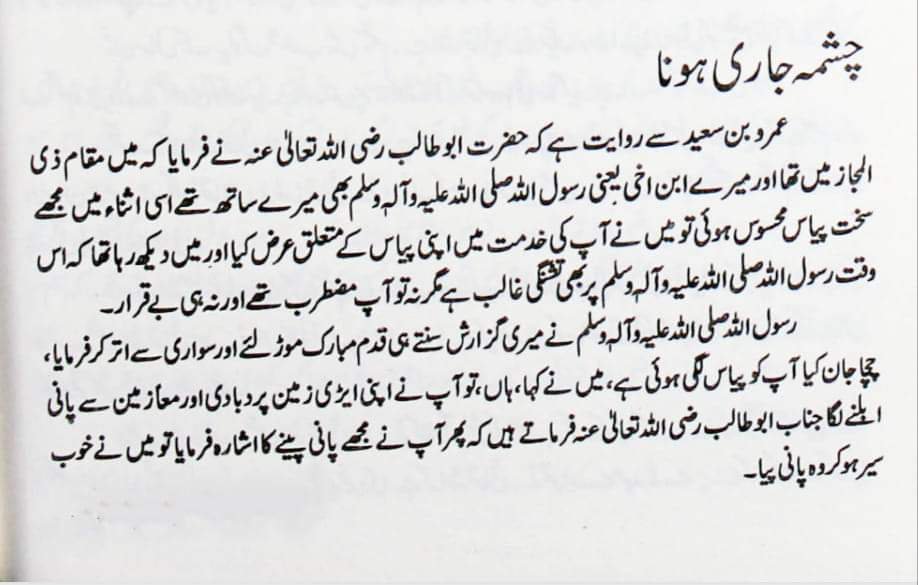 Sayyedna Abu Talib Alayhissalam Bayan Karte Hein Ki Mein Apne Ibn Akhi Yani Muhammad Mustafa Sallallahu Alaih Wa Aalihi Wasallam Ke Saath Maqame Zil Majaz Mein Tha, Isi Ashna Mein Mujhe Shadid Pyaas Mehsus Huyi Toh Mein Ne Aapki Khidmat Mein Apni Pyaas Ke Mutaliq Arz Kiya Aur Mein Dekh Raha Tha Ke Us Waqt Nabi Alayhissalam Par Bhi Tishnagi Galib Hai Magar Na Toh Aap Muztarib Thae Aur Na He Beqarar, Nabi Alayhissalam Ne Meri Guzarish Sunte He Qadam Mubarak Mood Liye Aur Sawari Se Utar Kar Farmaya Chacha Jaan Kya Aapko Pyaas Lagi Huyi Hai? Maine Kaha Haan Toh Aap Ne Apni Aydi Zameen Par Daba Di Aur Zameen Se Paani Ubalne laga Sayyedna Abu Talib Farmate Hein Ke Fir Aapne Mujhe Paani Pene Ka Ishara Farmaya Toh Maine Khub Sair Hokar Woh Paani Piya.