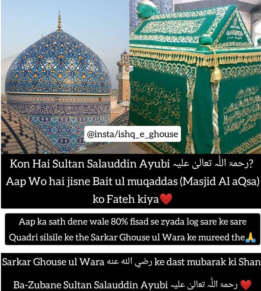 “Sultan Salahuddin Ayyubi ne jo Falasteen ko fatah kiya, us lashkar me aksariyat jin Ulama aur Mujahidon ki thi wo saare Huzoor Gaus-e-Pak ke Shagird they! Sarkar Gaus-e-Aazam ke Madarse se farig ut tehsil they! Falasteen jo fatah hua tha usme Sarkar Gaus-e-Aazam ka Faiz Shamil tha!