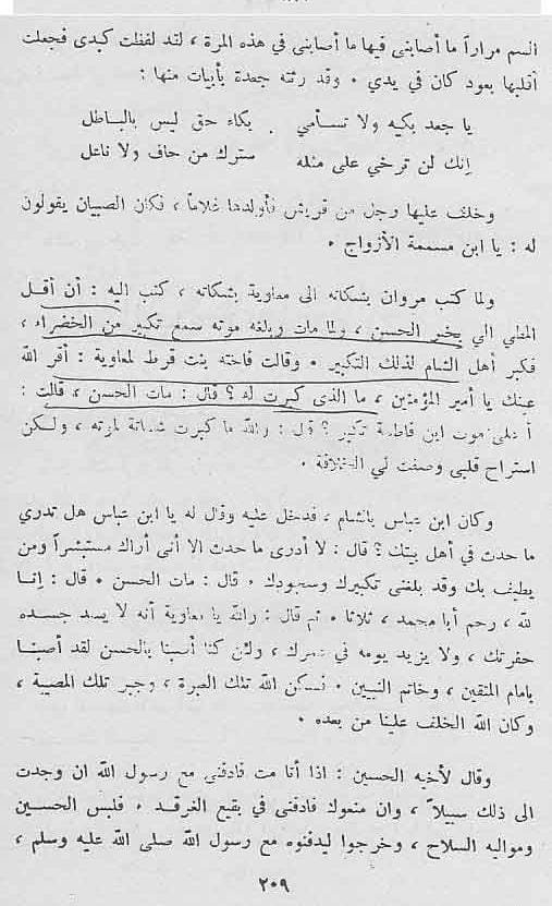 وهى اللتى اغراها معاوية بقتلة فقتلته بالسم(01) Ki Ja’dah Ko Ameer Muawiyah Ne Is Par Bar Angekhta Kiya Ki Woh Hasan Bin Ali Ko Zehr Pila De, Chunaanche Us Ne Imam Hasan Ko Zehr Pila Diya Jis Se Woh Faut Ho Ga’e.