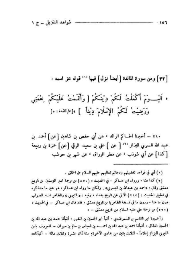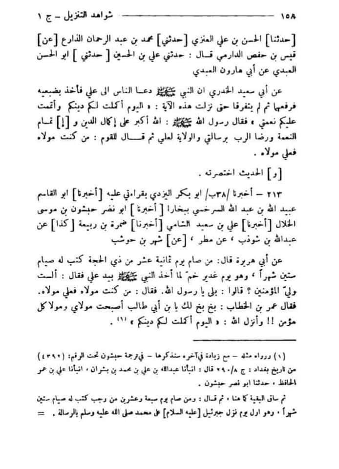 Ye Imam Hakim haskani hanafi Rehmatullah Alaih Ki book hai imam hakim haskani ko dahabi ne tazkira tul hufaz mai imam ul hufaz nabil jalil fazil kaha hai iske ilawa tabqat hanfia mai inko imam faqhi mujtahid jaise lafaz se yaad kiya gaya hai 1000 saal pehle ke inho ne apni book mai surah maida ayat 3 ke nuzul mai ek Hadees likhi hai jiski sanad sahih hai.