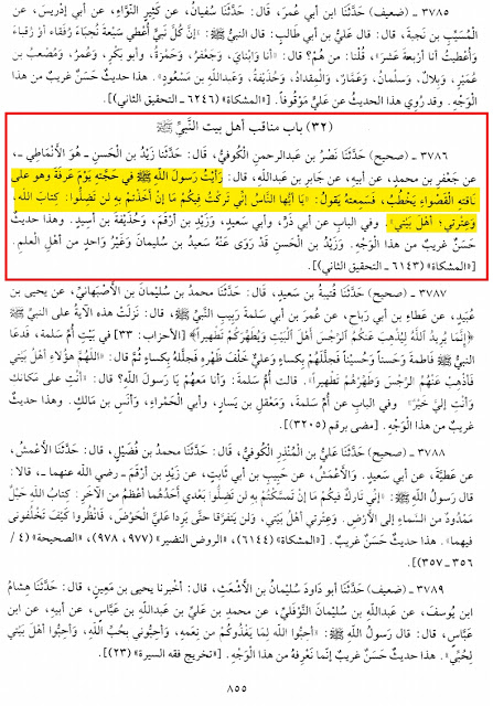 “Ek Roz Nabi E Karim صلى الله عليه وسلم Ne Makkah Aur Madina k darmiyan us paani k Makam me jise Khum Kaha Jaata hai, Khade Hokar Khutba Diya Jisme ALLAH Taala ki Hamd Wa Sana Ki Aur waaj Wa Nasihat Farmayi Phir Farmaya AYE LOGO khabardaar Hojao Mai ek bashar hoon ankarib mere Rab Ka Qasid aajaye aur mai uska bulawa kabool karlu aur MAI TUM LOGO ME DO WAZNI CHEEZ CHODE JAA RAHA HU, Jinme PEHLI TO ALLAH KI KITAB HAI JISME HIDAYAT WA NOOR HAI TUM ALLAH KI KITAB LO AUR USKO MAZBOOTI SE THAAM LO phir Kitabullah pe ubhara aur Targeeb di Phir Farmaya DUSRI CHEEZ MERE AHLE BAIT HAI, MAI TUMKO APNI AHLE BAIT K MUTALLIK ALLAH SE DARATA HOON MAI TUMKO APNI AHLE BAIT K MUTTALIK ALLAH SE DARATA HOON ”
