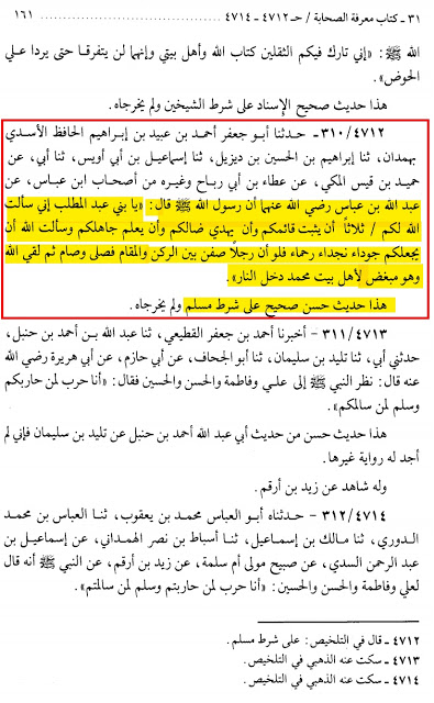 “Hazrat Abdullah ibn Abbas se Rivayat Hai Rasool Allah صلى الله عليه وسلم ne Farmaya Aye Banu Abdul Muttalib Maine Allah Taala Se Tumhare Liye 10 Chiz Maang li … Aakhir Me Farmaya Agar Koi Rukn Aur Makam Kay Darmiyan (Yaani Hazre Aswad aur Makam E Ibrahim) Qataar me Khada hojaye aur namaz padhe aur roza rakhe Aur phir issi haal me Allah Taala Se Jaa Mile kay us haal me Woh Ahle Bait Se Bugz Rakhne Waala ho to Dozakh Me Daakhil Hoga.