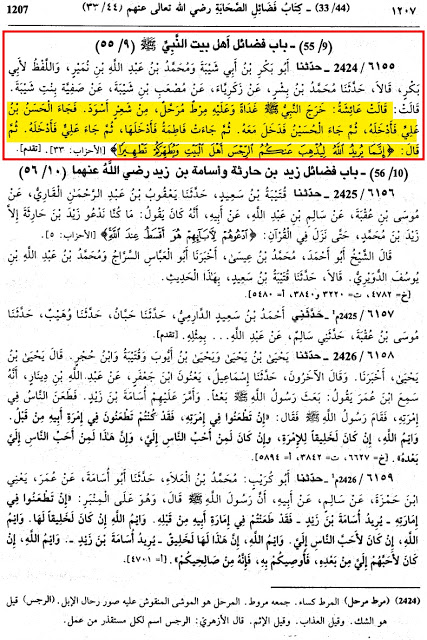 References :(Sahi Muslim, Kitabul Manakib, Baab : Fazail E Ahl E Bait E Nabi Sal Allahu Alaihiwassalam, Hadees : 2424) (Imam Hakim Al Mustadraq Vol : 03, Pg : 159, Hadees : 4707, 4709)(Imam Bayhaqi As-Sunan-ul-Kubra, Vol : 02 Pg : 149, Hadees : 2680) Scan Page Sahi Muslim Hadees : 2424