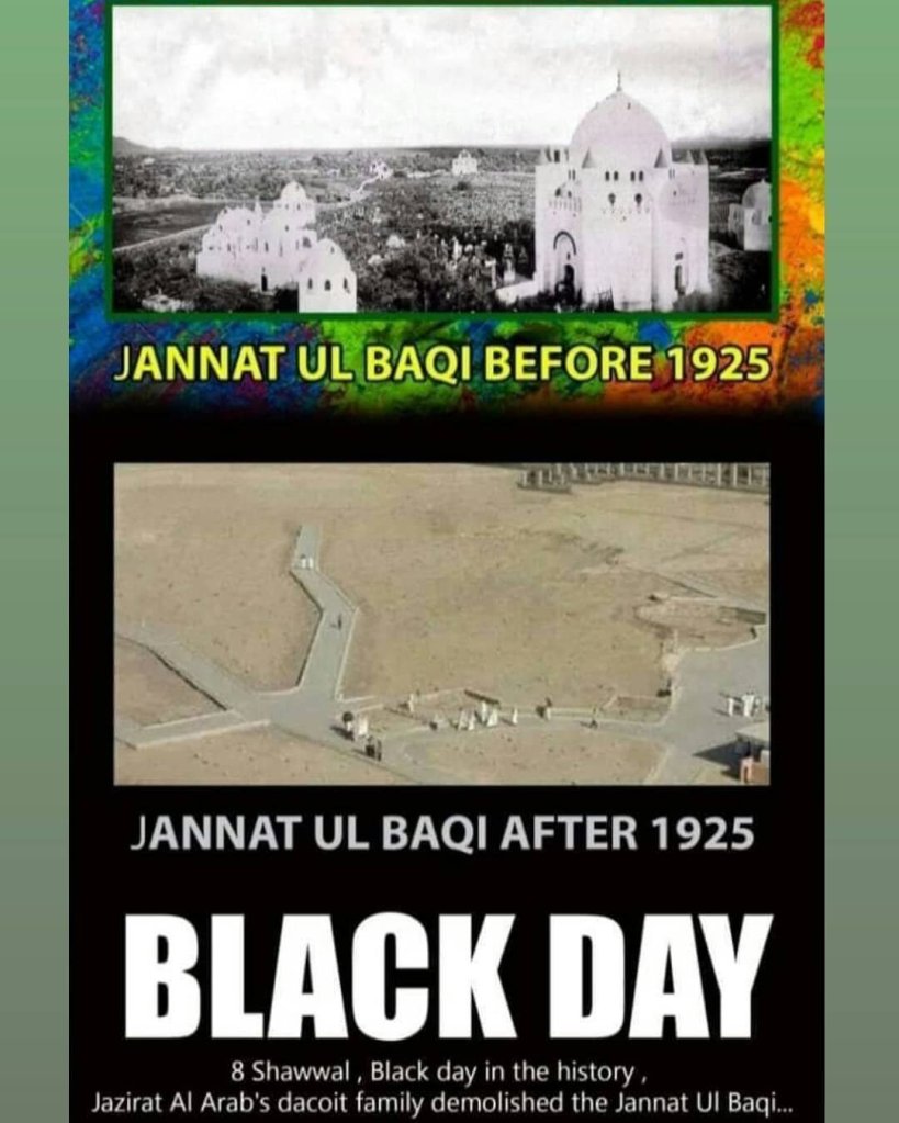 लेकिन अफसोस के साथ कहना पढ़ता है कि आले सऊद की जो अस्ल मे खैबर के यहूदीयो की एक शाख़ है’ ने 8 शव्वाल 1343 मुताबिक़ मई 1925 को इस अज़ीम क़ब्रिस्तान मे बनी हुई तमाम गुम्बदो और रोज़ो को शहीद कर दिया।