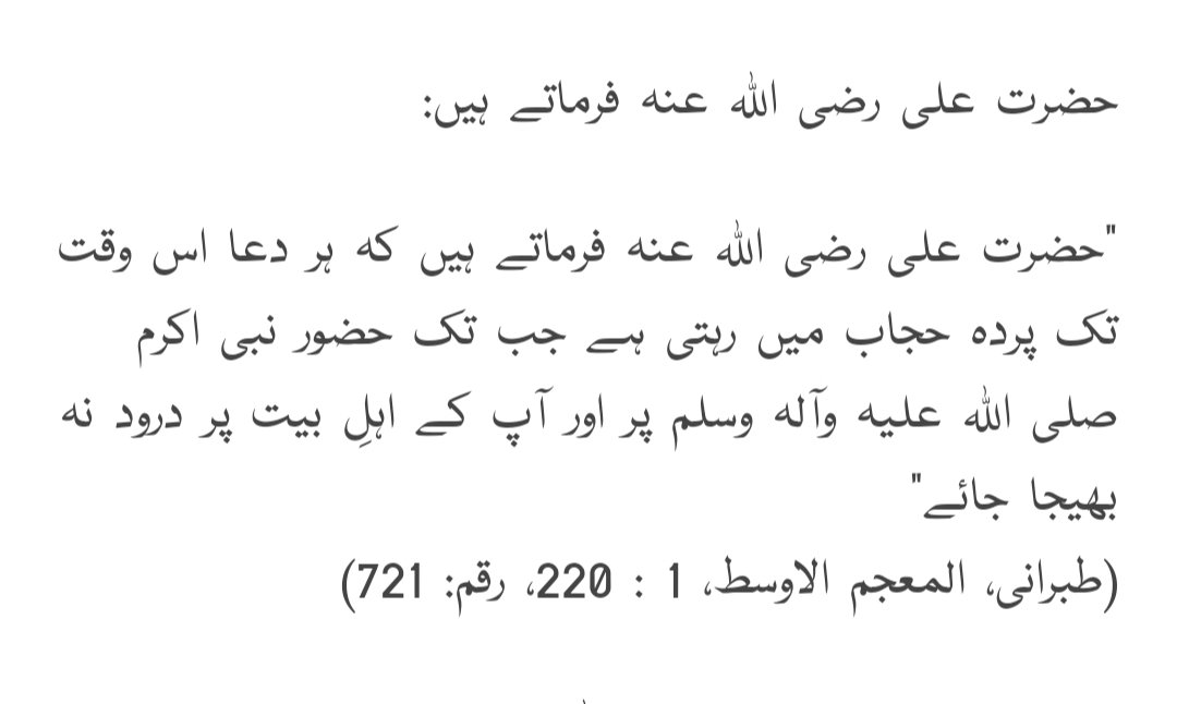 हज़रत अली रदिअल्लाह अन्हु फरमाते हैं हर दुआ उस वक़त तक परदाये हिजाब मे रहती है जब तक हुज़ूर नबी अकरम सल्लल्लाहु अलैहि व आलिही वसल्लम पर और आपके अहले बैत पर दुरूद न भेजा जाय (तिबरानी, अल मोजमुल अवसत 1:220, रकम 721)
