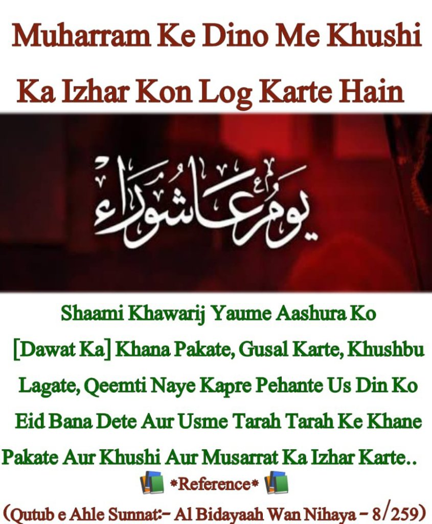 بِسْــــــمِ اللّٰهِ الرَّحْمٰنِ الرَّحِىْمِ Muharram Ke Dino Me Khushi Ka Izhar Kon Log Karte Hain Shaami Khawarij Yaume Aashura Ko (Dawat Ka) Khana Pakate, Gusal Karte, Khushbu Lagate, Qeemti Naye Kapre Pehante Us Din Ko Eid Bana Dete Aur Usme Tarah Tarah Ke Khane Pakate Aur Khushi Aur Musarrat Ka Izhar Karte.. 📚 Reference 📚 (Qutub e Ahle Sunnat:- Al Bidayaah Wan Nihaya – 8/259)