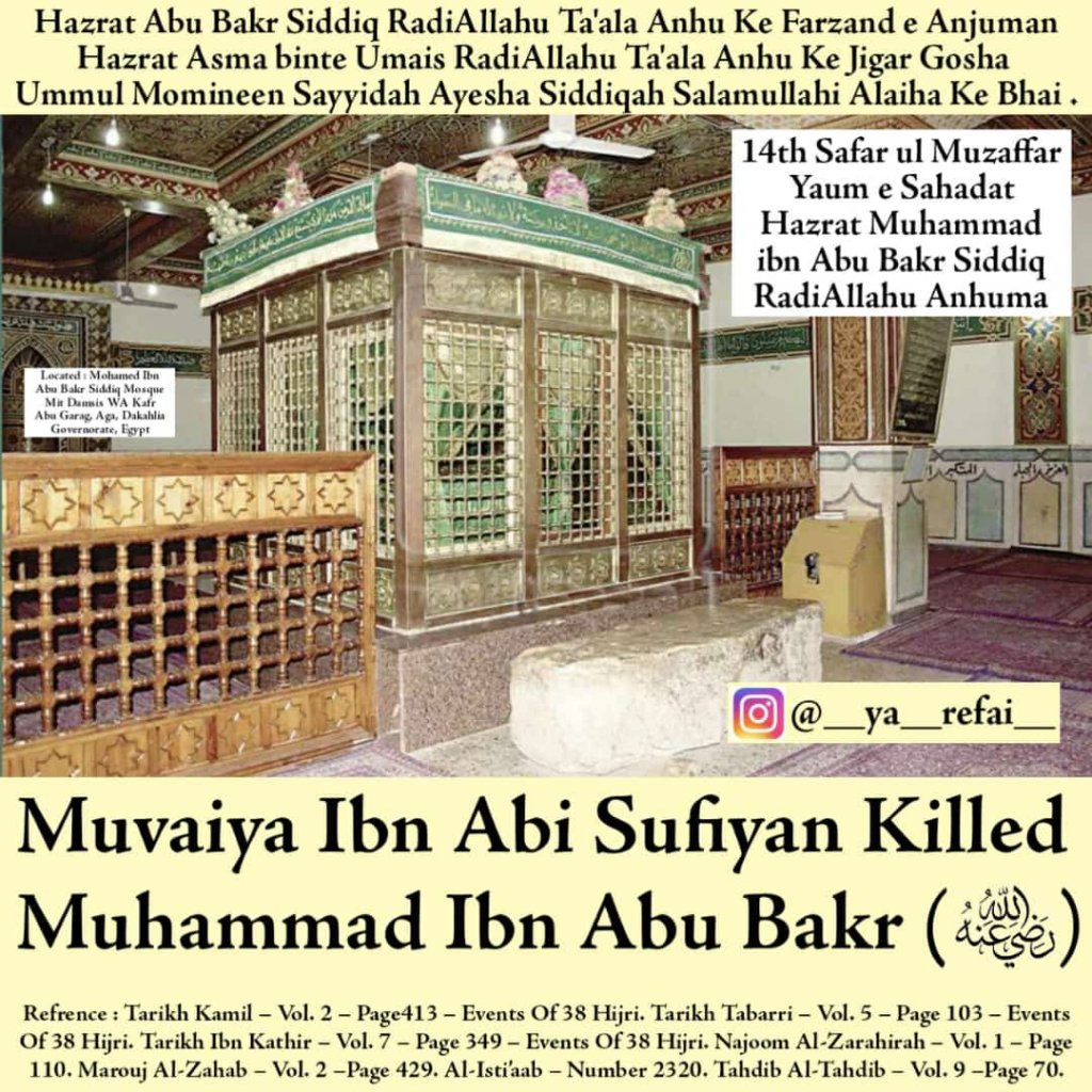 14_Safar ko Sayyeduna Abu Bakr Siddiq RadiAllahu Anhu ke Shehzade, Maula Ali Alaihissalam ke Adopted Bete (Godh liye hue Bete), Sayyeduna Imam Jafar Sadiq Alaihissalam ke Par-Nana, Hazrat Sayyeduna Muhammad bin Abu Bakr RadiAllahu Anhuma ki Shahadat ka Din hai.