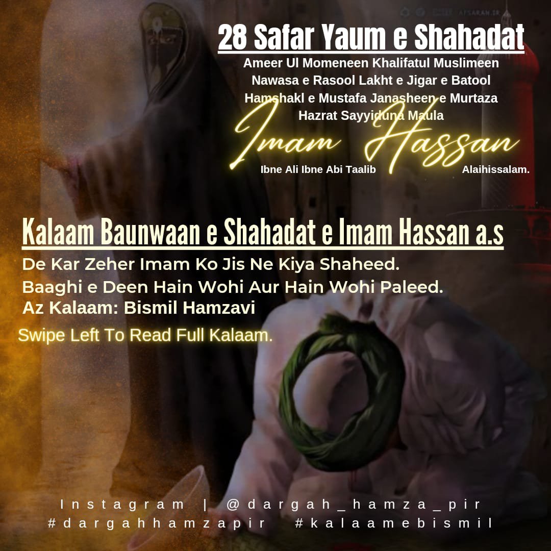 “O the person who has taken the name of Hazrat Ali with unseemly lack of respect, I am Hasan. My father is Ali, you are Moavia and your father Sakhar. My mother is Fatima and your mother is Hind. My grandfather is the Messenger and your grandfather, Harab. My grandmother is Khadija and your grandmother is Qateela. Now may God curse the person amongst both of us, who exceeds in profanity, hypocrisy and in enormity of evil mindedness and wickedness, May God curse such a person.’