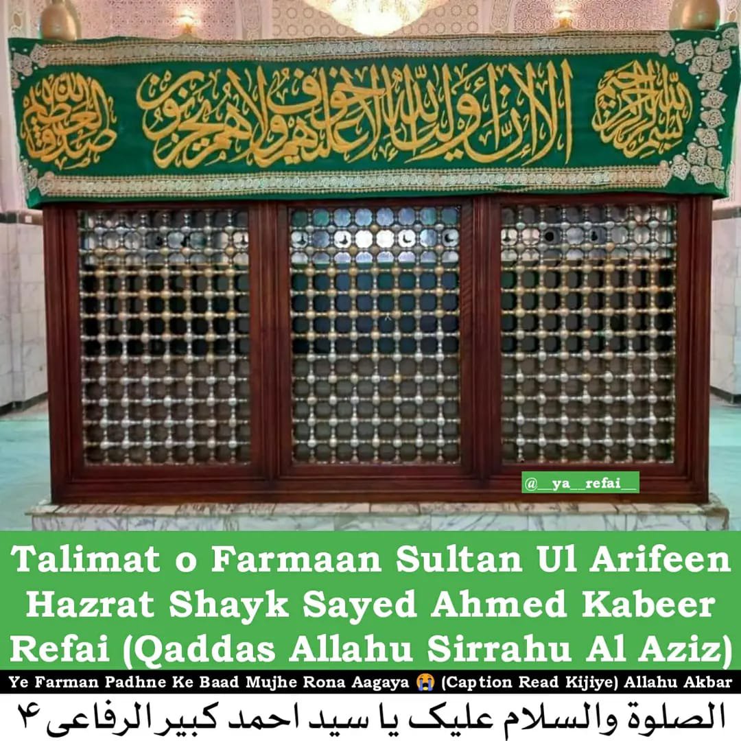 HAZRAT SAYYED KABIR AHMED RIFAI SILSILAE RIFAIYA K BAANI HAI.. AAP HUSSAINI SAYYED HAI.. IMAM MUSA KAZIM A.S SE APKA NASAB MILTA HAI.. JAB KAPKI WALEDA NAJJARI KHANDAN SE THI.. JO PYARE NABI A.S KA NANIYAK THA.. APK WALID KA NAME ABUL HASAN THA.. ABHI SAYYED KABIR AHMED RIFAI BAHOT CHOTE THE KY APK WALID KA WISAL HO GAYA… SAYYED KABIR AHMED RIFAI R.A KIWILADAT KY 40 DIN PAHLE APKY MAMU SHAIKH MANSUR AL BATAHI ANSARI R.A KY KHOWAB ME HUZOR A.S TASHRIFLAK FARMAE KY APKI BAHEN KYAHA EK BETE KIWILADAT HO GIUSKA NAME AHMED RAKHNA OR USKI TARBIYAT KLIYE USKO SHAIKH ALI WASTI KY PAS BHEJNA… 15 RAJJAB 512 HIJRI ME AAP PAIDA HOE.. SAYYED KABIR AHMED RIFAI R.A IMAM SHAFAI R.A KY MUQALLID THE… SARKAR GAUSE AZAM R.A SE APKI UMAR 42 YEAR KAM THI.. SARKAR GAUSE PAAK APKI BAHEN KO APNI BAHEN FARMAE THE… SAYYED KABIR AHMED RIFAI R.A APNE MURDEEN SE FARMATE KY IJZ WO INKESARI OR MAKHLOQ KI KHIDMAT SE ALLAH TAK POHCHNEK TUM BAHOT SE DARJAAT TAE KR LO GE.. SAYYED KABIR AHMED RIFAI R.A MAKHLOQ KI AYSI KHIDMAT KRTEK ANDHO KO TALASH KR KR KY UNKO INKI MAZIL TAK POHCHATE.. 7 SAAL KI UMAR ME AAP NE QURAN HIFZ KR