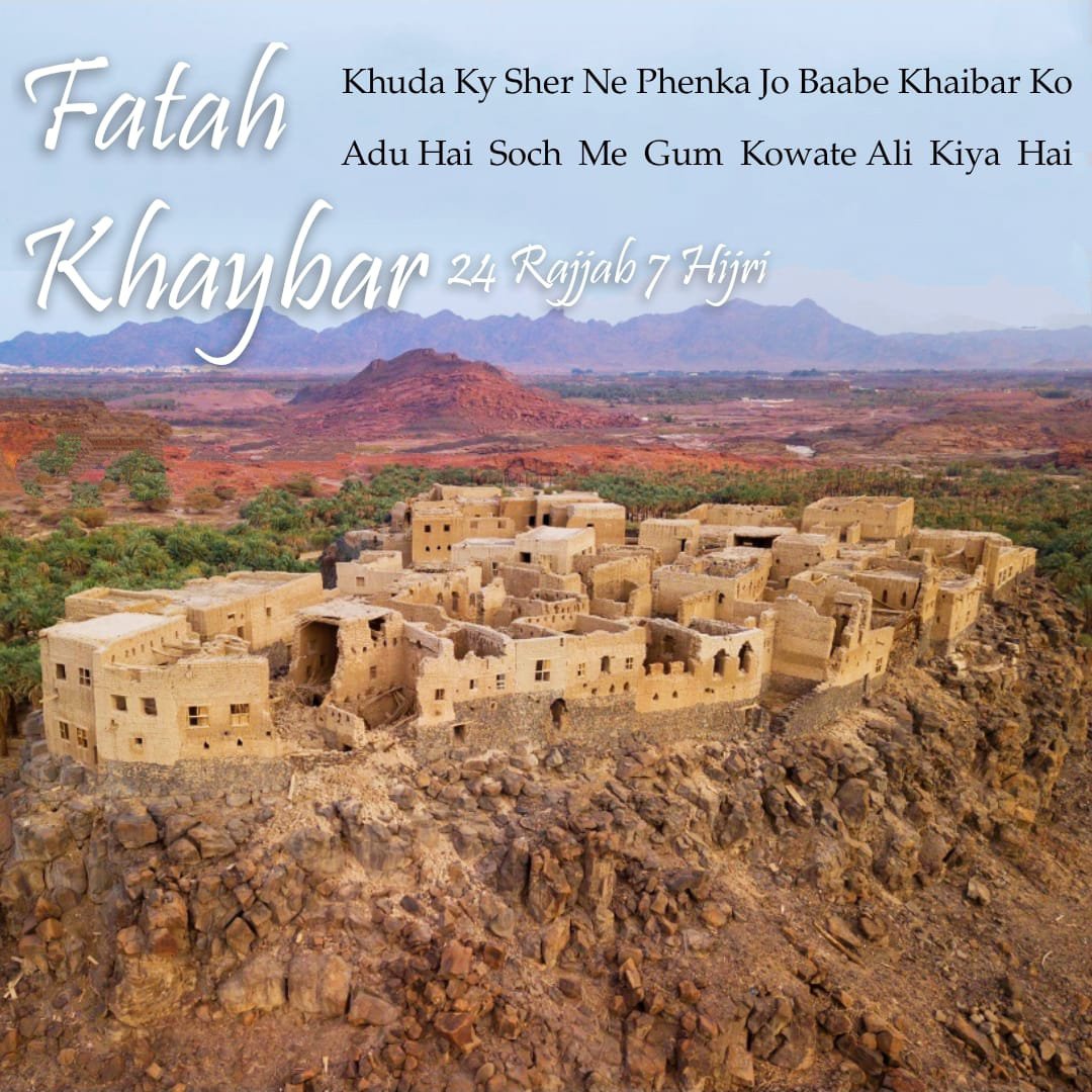 24 Rajab 7 Hijri Mein Sayyedul Ambiya (s.a.w) Khaybar Ke Yahudiyon Ki Saajhishon Ko Anjaam Tak Pauhauchaney Ke Liye 1600 Ke Lashkar Ke Saath 14000 Yahudiyon Se Nabard Aazma Honey Ke Liye Khaybar Mein Aaye, Ibteda Mein Islaami Lashkar Ki Yahudiyon Se Chand Jhadpey Hui Magar Jab Fateh Ki Surat Nazar Na Aayi Toh Sarwar-e-Aalam (s.a.w) Ne Farmaya “Kal Hum Uss Mard Ko Alam Dyengey Joh Raah-e-Farrar Iqtiyaar Karney Waala Nahi Hoga, Khudaa Aur Isske Rasool (s.a.w) Jissey Dosth Rakhtey Hai, Innhi Ke Haathon Fateh Hogi”, Agley Din Islaam Ka Alam Ley Ke Maula Paak Ameer-e-Kaiynaat Ali (a.s) Maidaan Mein Utrey, Alam Sanglaakh Chataan Mein Ghaada Aur Dushman Ko Lalkaara, Marhab Ka Bhai Muqaabley Mein Aaya Toh Issey Finnar Kiya Phir Marhab Ke Do Tukdey Kiye, Baad Mein Khaybar Ka Dar Ukhaadkar Issey Dhaal Banaa Kar Khaybar Mein Maujood 7 Kilon Ko Naa’am, Katiba, Shaq, Nitaata, Wati, Salaalam Aur Khamoos Par Islaami Parcham Lehraa Diya.