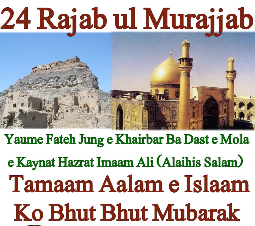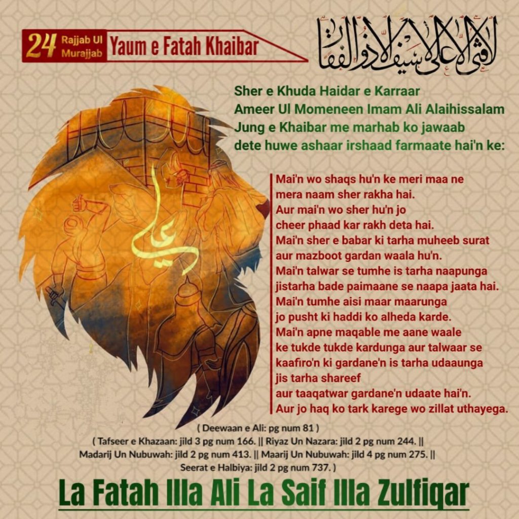 *24 Rajab ul Murajjab 7 Hijri Mutabik 628 Esvi Ko Khaibar Fatah Hua Tha, Kai Dino Tak Rozana Alag Alag Islami Commanders Lashkar Lekar Jate The Magar Fatah (Jeet) Nahi Milti Thi, To Huzoor Ahmad e Mujtuba Muhammad Mustufa (Sallallahu Alaihi wa Aala Aalehi wa Sallam) Ne Farmaya Kal Me Alam (Jhanda) Usko Dunga Jo Allah Aur Uske Rasool Se Muhabbat Karta Hai Aur Allah Aur Uska Rasool Usse Muhabbat Karte Hain, Wo Jeet Kar Hi Wapas Aayega, Sahaba Kehte Hain Ke Hum Raat Bhar Yehi Sochte Rahe Ke Kon Wo Khushnaseeb Hoga Jise Huzoor (Alaihis Salam) Jhanda Ata Farmayenge, Jab Subha Hui To Huzoor (Alaihis Salam) Ne Farmaya Ali Ibne Abu Talib Kahan Hain ? Sahaba e Ikraam Ne Arz Kiya:- Ya Rasool Unki Aankho Me Taklif Hai, Huzoor (Alaihis Salam) Ne Farmaya Unko Bulao, Mola Imaam Ali (Alaihis Salam) Ko Bulaya Gaya, Huzoor (Alaihis Salam) Ne Unki Aankho Me Luaab e Dahan Dala Aur Unke Haq Me Dua Ki To Aankhen Is Tarah Thik Ho Gyi Jese Kabhi Taklif Hi Nahi Thi, Phir Huzoor (Alaihis Salam) Ne Mola Ali (Alaihis Salam) Ko Jhanda Ata Farmaya, Uske Bad Mola Ali Gye Aapne Marhab Naami Mashoor Jungju Pehalwan Ko Wasil e Jahannum Kiya, Fir Jab Ladte Hue Aapki Dhaal Toot Gayi To Aapne Khaibar Ke Kiley (Fort) Ke Darwaze Ko Ak Haath Se Ukhaad Diya Aur Use Dhaal Ki Tarah Istemal Farmaya Aur Is Tarha Fatah Hui, Sahaba e Ikraam Kehte Hain Ke Baad Me Hum 40 Log Bhi Us Darwaze Ko Palatne Ki Koshish Karte Rahe Lekin Palta Na Sake Jisko Maula Ali (Alaihis Salam) Ne Ak Haath Se Uthakar Puri Jung Me Dhaal Ki Tarah Istemal Farmaya Aur Ak Jagah Phenk Diya…*