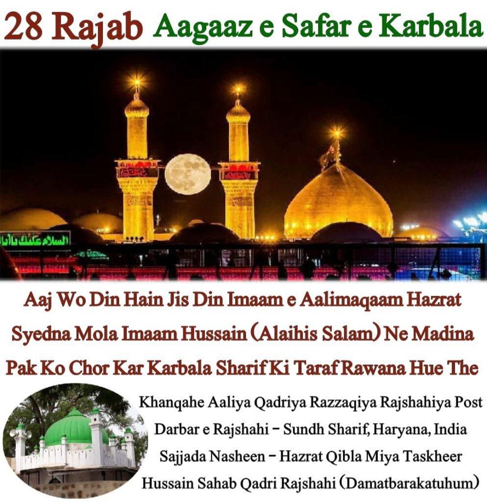 *28 Rajab ul Murajjab 60 Hijri Itwar Ki Shab Hazrat Syedna Mola Imaam Hussain (Alaihis Salam) Ne Madina Pak Se Karbala Sharif Ki Taraf Apne Safar Ka Aagaz Kiya, Jisme Aapke Sath Chand Afraad Bhi Shamil The, Jinme Kuch Khawateen Bhi Thi, Madina Pak Se Ruksati Ke Waqt Mola Imaam Hussain (Alaihis Salam) Apne Nana Jan Sarkare Do Alam Huzoor Ahmad e Mujtuba Muhammad Mustafa (Sallallahu Alaihi wa Aala Aalehi wa Sallam) Ke Mazar Mubarak Par Jate Hain Aur Apna Sir Mubarak Apne Nana Jan Ke Mazar Mubarak Rakhkar Kehte Hai :- Nana ﷺ Jis Madine Ki Galiyon Me Apka Hussain Apke Kandho Par Baithkar Ghoomta Tha Aaj Iss Madine Ki Galiyo Ko Chorkar Aapka Hussain Ja Raha Hain, Nana ﷺ Aapki Ummat Ne Arsaye Hayaat Tang Kar Di Hain, Aur Aapne Jo Wasiyate Mere Liye Apni Ummat Se Ki Thi To Logo Ne Unhe Faramosh Kar Diya Hain Aur Ab Mere Qatl Par Aamadah Hain, Iske Bad Huzoor (Sallallahu Alaihi wa Aala Aalehi wa Sallam) Ke Mazar e Aqdas Se Aawaz Aati Hain:- “Aye Bete Hussain Wo Waqt Aa Gaya Hai Jiska Tumne Bachpane Me Wada Kiya Tha, Aye Hussain Khuda Hafiz! Tum Tanha Nahi Ja Rahe Ho Ye Tera Nana Bhi Qadam Qadam Par Tumhare Sath Hain, Uske Bad Mola Imaam Hussain (Alaihis Salam) Apni Walida Majida Syyeda e Kaynat Syyeda Fatima Zehra (Salamun Aleha) Aur Apne Bhai Hazrat Syedna Mola Imaam Hasan (Alaihis Salam) Ke Mazar Mubarak Par Tashrif Late Hain Aur Salam Pesh Karte Hain, Fir Aap Madina Pak Se Rawana Hote Hain, 28 Rajab ul Murajjab Ko Aapne Madina Sharif Se Apna Safar Shuru Kiya Makkah Sharif Pouche, Fir 8 Zilhijja 60 Hijri Ko Aapne Makkah Sharif Ko Chora Aur 2 Muharram 61 Hijri Ko Aap Karbala Sharif Pouche, Aur 10 Muharram Ko Aapko Aapki Aulad Aapke Sathiyo Ke Sath Badi Hi Bedardi Ke Sath Shaheed Kar Diya…*