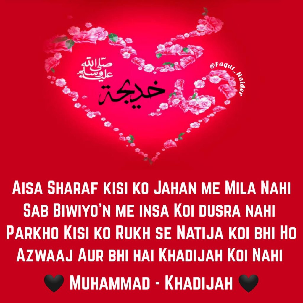 “Hazrat Ayesha Siddiqa Salam ullah alaiha bayan farmati hai ke Huzoor Nabi-e-Akram SallAllahu ta’ala wa’ala aale hi Wasallam jab kabhi bhi Hazrat Khadija Salam ullah alaiha ka Zikr farmate to Unki khoob Taareef farmate. Aap farmati hain ke ek din Mai gusse me aagayi aur Maine kaha ke Aap surkh Rukhsaaro Waali ka tazkira bahot zyada karte hain halanke Allah Tabarak wa Ta’ala ne Us se behtar Aurate Uske Nema Badal ke tour par Aapko ata farmayi hain. Aap SallAllahu ta’ala wa’ala aale hi Wasallam ne farmaya:
