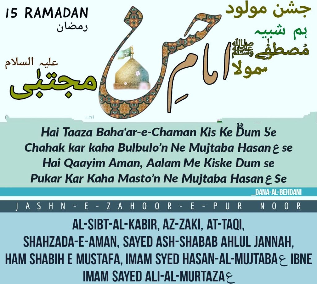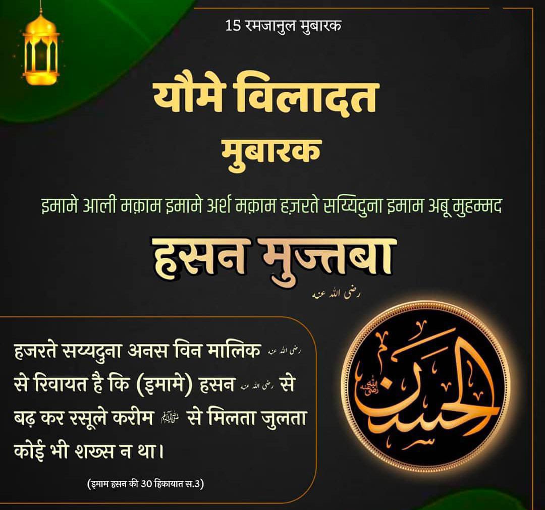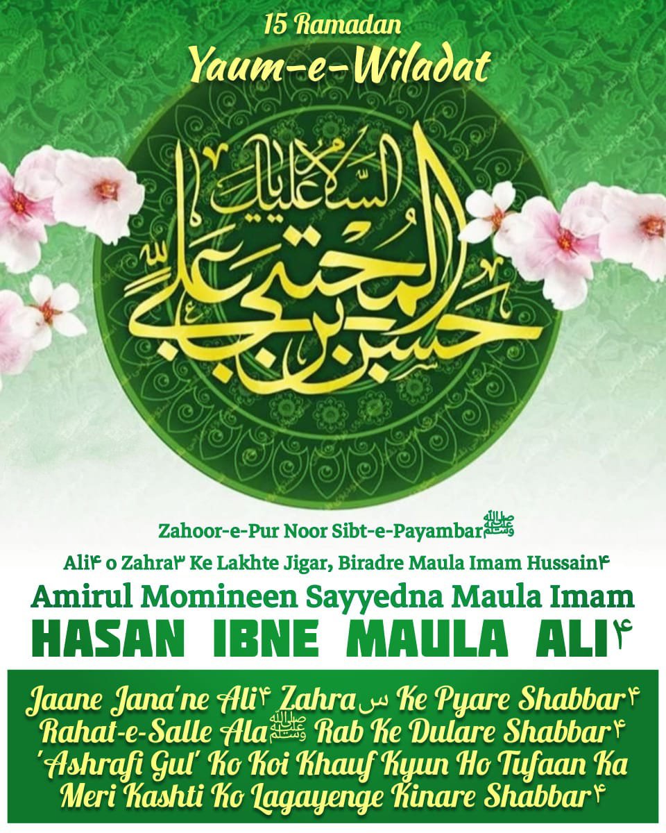 *15 Ramzan Youm-e-Wiladat (Birthday) Shabeeh-e-Mustafa, Rehan-e-Mustafa (Huzoor ke Phool), Noor-e-Nazar-e-Zahra o Murtaza, Sayyada Shabab-e-Ahlil Jannah, Panchwe Khalifa-e-Raashid, Amir al Momineen Abu Muhammad Hazrat Sayyeduna Imam Hasan al-Mujtaba RadiAllahu Anhu Alaihiswalatu was-Salam!!*