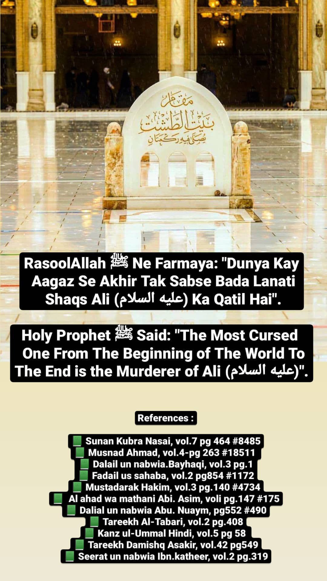 *19 Ramzan 40 Hijri Ki Wo Raat Thi Tahajjud Ka Waqt Tha Abdur Rehman Ibne Muljim Lanti (Jisko Shehansha e Qull Aalam Huzoor Ahmad e Mujtuba Muhammad Mustafa Sallallahu Alaihi wa Aala Aalehi wa Sallam Ne Puri Insaaniyat Me Se 2 Badbkaht Tareen Insano Me Se Ak Karar Diya Tha) Us Laeen Ne Mola e Kaynat Mola Imaam Ali (Alaihis Salam) Ke Sare Aqdas Pe Zehar Me Dubi Hui Talwar Se Waar Kiya, Is Waar Ke Zakham Aur Zehar Ke Asar Se 21 Ramzan 40 Hijri Ko Mola Ali (Alaihis Salam) Ne Is Duniya e Faani Se Parda Farma Liya, Jab Us Laeen Ki Talwar Aapke Sare Aqdas Pe Lagi To Aapki Zubaan e Paak Se Ye Alfaaz Nikle:- Fuztu Bi Rabbil Kabah Yani Rabbe Kabah Ki Qasam Me Kamyab Ho Gaya, Huzoor (Alahis Salam) Ne Mola Ali (Alaihis Salam) Ke Qatil Ibne Muljim (Lanti) Ke Liye Farmaya Tha:- Duniya Ke Aagaz Se Aakhir Tak Sabse Bada Lanti Shaks Ali Ka Qatil Hain, Hazrat Muhammad Hanfiya Bin Imaam Ali (Alaihis Salam) Ne Bayan Kiya Ke Jab Ameer ul Momineen Mola Ali (Alaihis Salam) Ko Zarb (Talwar) Lagne Ke Bad Jab Ibne Muljim Ko Aseer Kar Liya Gaya To Ameer ul Momineen Imaam Ali (Alaihis Salam) Ne Use Dekhar Farmaya :- Mera Qatil Ghabraya Hua Lagta Hain Isko Sharbat Pilao Jab Tak Ye Tumahre Paas Aaseer Hain Iske Sath Husn Sulook Se Pesh Aao Isko Aala Khana Khilana Aur Behtareen Bistar Do Agar Me Hayat Raha To Mujhe Ikhtiyar Hain Ke Ise Saza Du Ya Maaf Karu Aur Agar Me Tum Me Na Raha To Phir Khuda Ka Hukum Pura Karna Lekin Iski Laash Ko Mat Jalana Aur Na Hi Iske Aaza Katna Kyuki Aey Mere Baccho Allah Had Se Badh Jane Walo Ko Pasand Nahi Karta, Hasan Bin Kaseer Apne Walid Se Bayan Karte Hain Unhone Ameer ul Momineen Syedna Mola Ali (Alaihis Salam) Ka Zamana Paya Tha Unhone Bayan Kiya:- Syedna Mola Ali (Alaihis Salam) Fajr Ki Namaz Ke Liye Jaa Rahe The To Batakho (Duck) Ne Unke Samne Aakar Aawaaze Nikalne Aur Chikne Lagi Logo Ne Unhe Bhagana Chaha To Syedna Ali Farmane Lage Unhe Chor Do Ye Noha Kar Rahi Hai Pas Unpar (Mola Ali) Par Ibne Muljim Ne Waar Kiya Mene Arz Kiya:- Ameer ul Momineen Hum Jane Aur Wo (Ibne Muljim Aur Uska Qabila Jane) Na Kabhi Uska Koi Leader Hoga Aur Na Reaaya Syedna Ali Ne Farmaya:- Nahi Use Qatl Mat Karna Albatta Giraftar Karlo Agar Me Faut Ho Gaya To Use Qatl Kar Dena Agar Me Bach Gaya To Zakhmo Ka Qisas Hoga…*