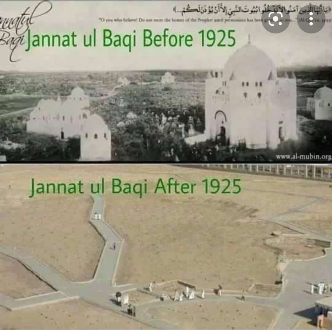 अफ़सोस कि 8 शव्वाल 1344 हिजरी (1925) में आले सऊद ने बनी उमय्या और बनी अब्बास के क़दम से क़दम मिलाते हुए नबी ए करीम (स) के पाक ख़ानदान की क़ब्रों को वीरान कर के उसे खंडर में बदल दिया जिस से उनकी पैग़म्बरे अकरम (स) और उनकी आल से दुश्मनी, उनकी कट्टरता, क्रूरता और हिंसक स्वभाव ज़ाहिर हो चुका है…