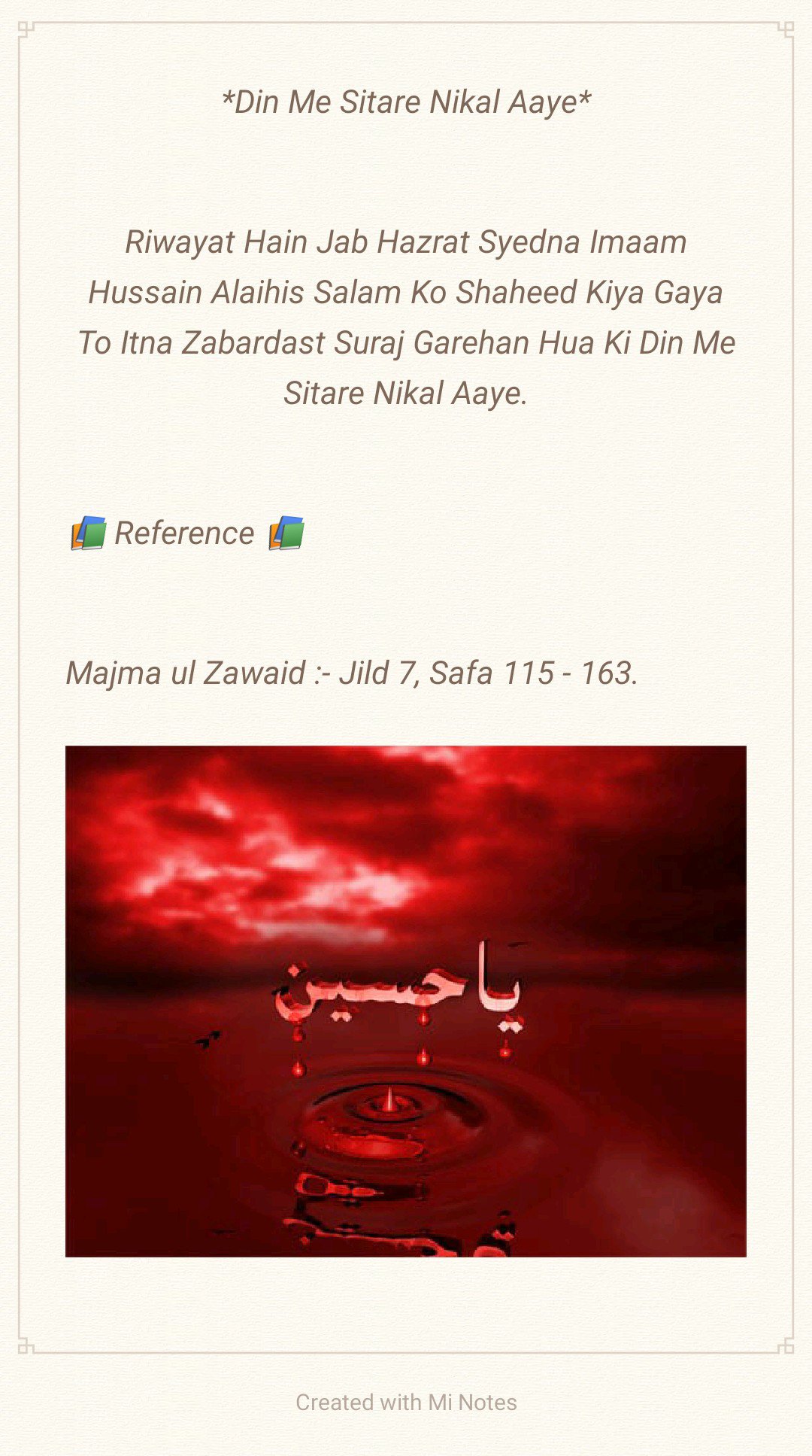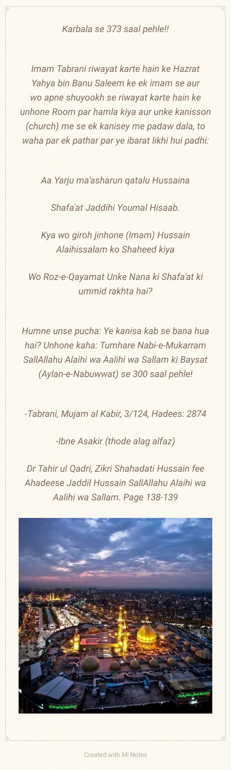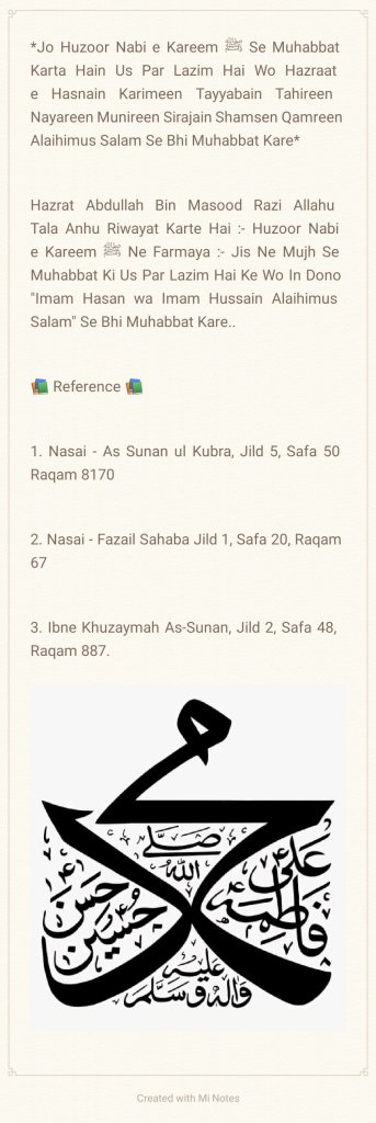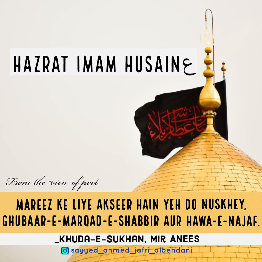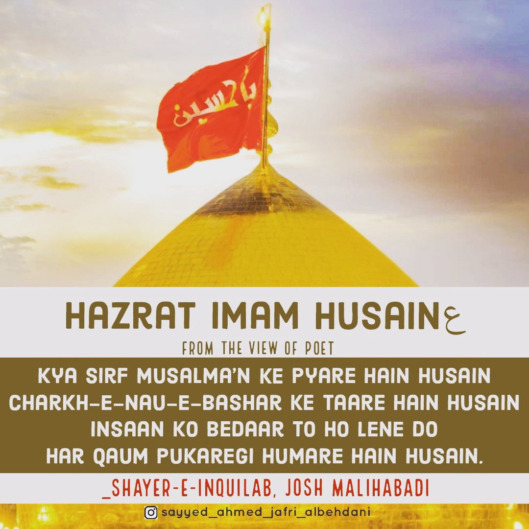 *Aapki Wiladat 5 Shaban ul Muazzam 4 Hijri Mutabik 8 January 626 Esvi Baroz Mangal Me Hui, Aapki Shahadat 10 Muharram 61 Hijri Mutabik 10 October 680 Esvi Baroz Juma Hui, Aap Shehansha e Qull Aalam Huzoor Ahmad e Mujtuba Muhammad Mustufa ﷺ Ke Nawase Aur Mola e Kaynat Mola Imaam Ali Alaihis Salam Aur Syyeda e Kaynat Syyeda Fatima Zehra Salam un Aleha Ke Shehzadaye The, Aapki Shan Me Huzoor Alaihis Salam Ne Farmaya:- Hasan Aur Hussain Jannati Jawano Ke Sardar Hain, Hasan Aur Hussain Hi To Mere Gulshane Duniya Ke Phool Hain, Hussain Mujh Se Hain, Me Hussain Se Hu, Jisne Hussain Se Muhabbat Ki Usne Mujh Se Muhabbat Ki, Jisne Hussain Se Bugz Rakha Usne Mujh Se Bugz Rakha, Huzoor Alaihis Salam Aapke Liye Apna Sajda Taweel Fama Diya Karte The, Huzoor Alaihis Salam Aapke Liye Khutba Chor Kar Mimbar Sharif Se Neeche Tashrif Liyaya Karte The, Huzoor Alaihis Salam Apko Apni Dosh Mubarak Par Bedha Kar Sawari Karate The, Aapki Shahadat Ki Khabar Hazrat Jibreel Alaihis Salam Ne Aapke Nana Huzoor Alaihis Salam Ko Aapke Bachpan Me Hi Dedi Thi, Aapne 25 Martaba Paidal Hajj Ada Kiya, Aap Aa’imma e Ahle Baith Ke Teesre Imaam Hain, Aap 28 Rajab 60 Hijri Ko Madina Pak Ko Chora, 8 Zilhijja Ko Aapne Makka Sharif Ko Chora Aur Karbala Sharif Ki Taraf Rawana Hue, 2 Muharram 61 Hijri Ko Aap Karbala Sharif Pouche, 7 Muharram Ko Yazeedi Foj Ne Apke Qafile Ka Pani Band Kar Diya, Aur 10 Muharram Ko Aapko Badi Hi Bedardi Ke Sath Shaheed Kar Diya, Aapke Sath Karbala e Mualla Me 72 Shohada Shaheed Hue, Jinme Mashoor Aapke Bhai Hazrat Ghazi Abbas Alamdar, Aapke Shezade Hum Shakle Paighambar Hazrat Ali Akbar, Aapke Shezadaye Hazrat Ali Asghar, Aapke Bahanje Hazrat Aun, Hazrat Muhammad, Aapke Bhatije Hazrat Qasim, Aapke Bachpan Ke Dost Hazrat Habeeb Ibne Mazahir Alaihimus Salam Ye Sab Hazraat Shaheed Hue, Mola Imaam Hussain Alaihis Salam Ki Shahadat Ke Bad Jab Yazeedi Foj Ne Apke Sar Mubarak Ko Neze Par Buland Kiya To Apne Neze Par Bhi Quran Sharif Ki Tilawat Farmayi, Aapki Shahadat Ke Din Suraj Girhan Me Aa Gya, Aapki Shahadat Ke Din Se 6 Mah Tak Aasman Ke Kinare Surkh Rahe Bad Me Rafta Rafta Wo Surkhi Jati Rahi, Albatta Afaq Ki Surkhi Jisko Shafaq Kha Jata Hain Aaj Tak Mojood Hain Ye Surkhi Shahadat e Imaam Hussain Se Pehle Mojood Na Thi, Aapka Mazar Mubarak Karbala Sharif, Iraq Me Marjai Khaliak Hain…*