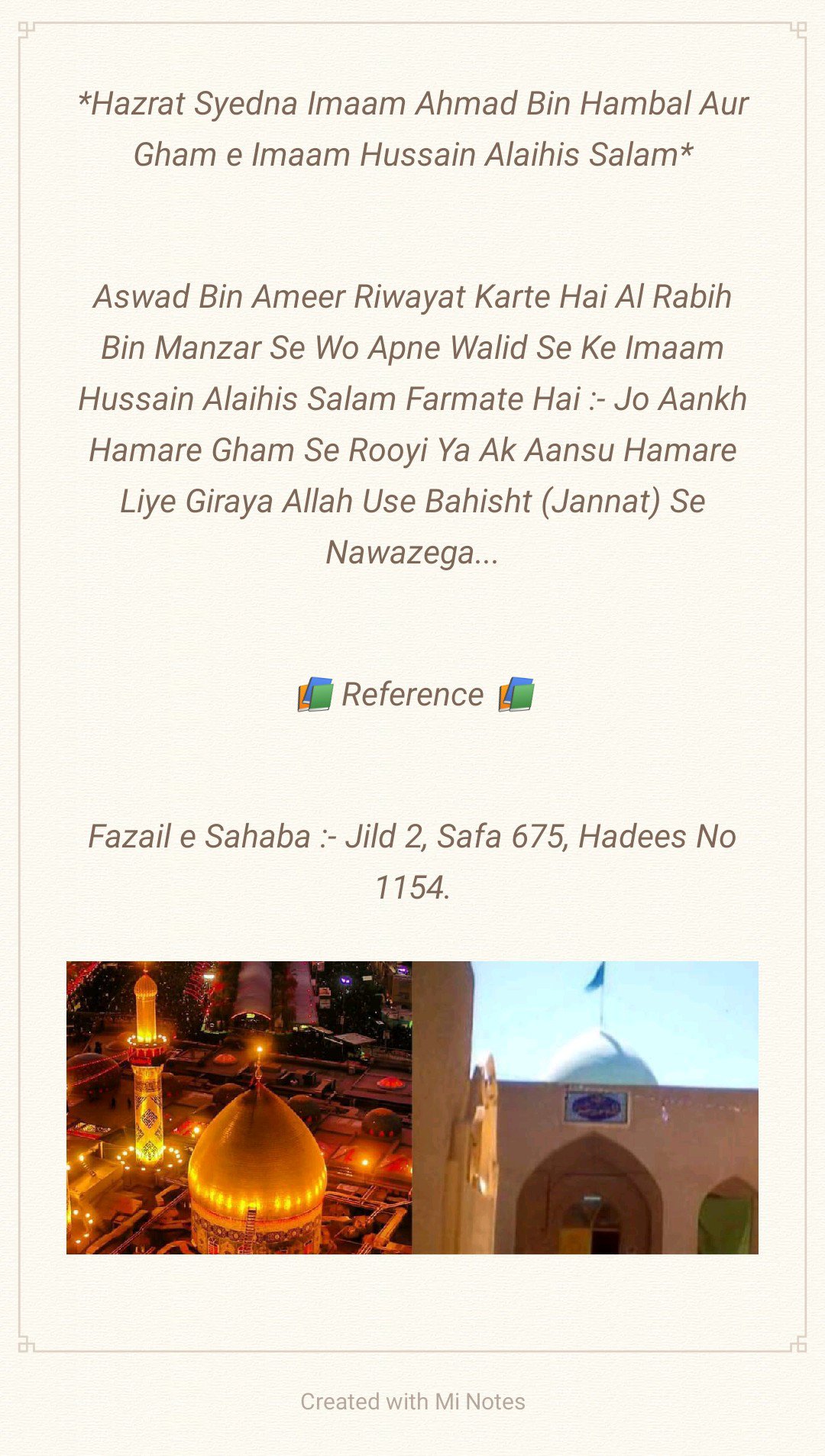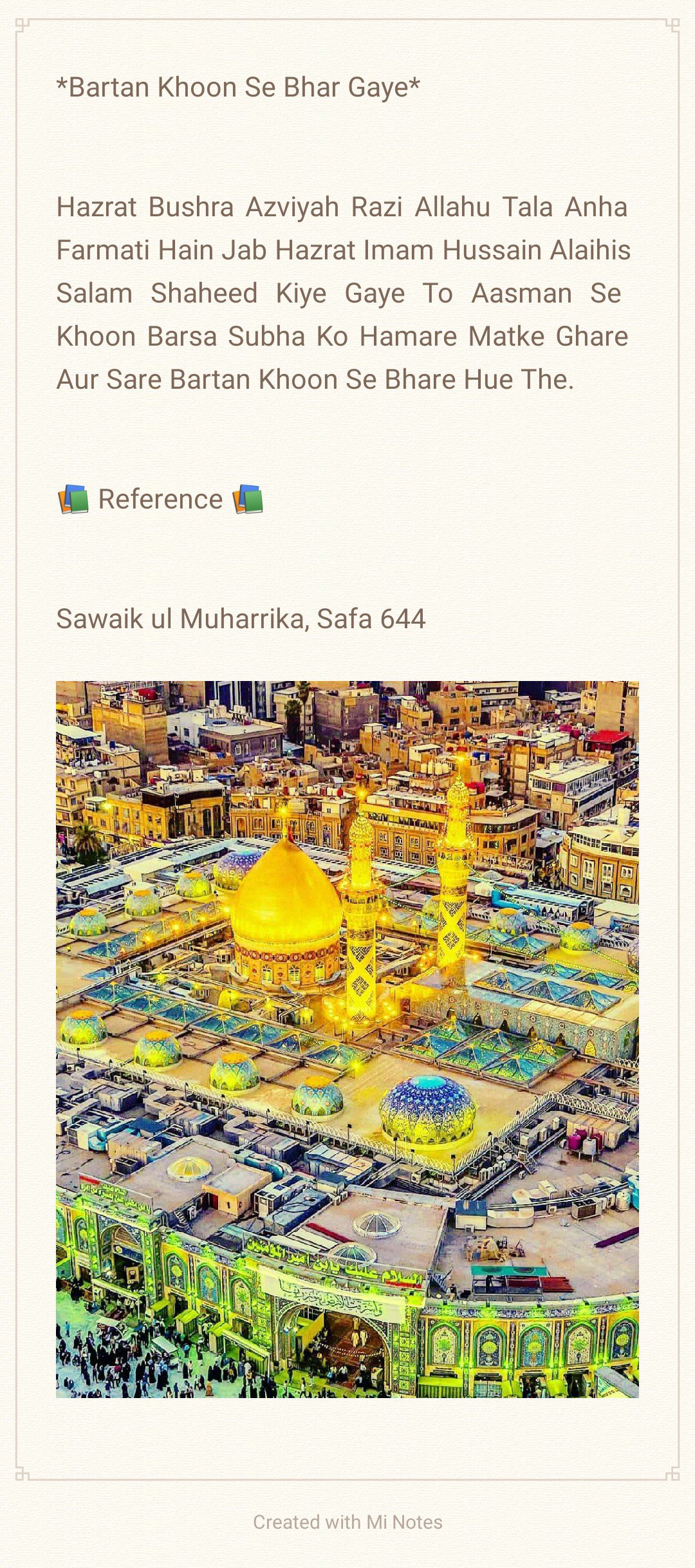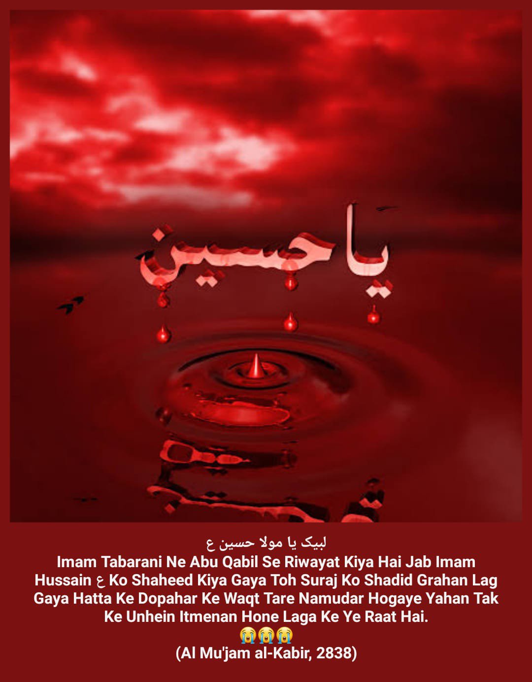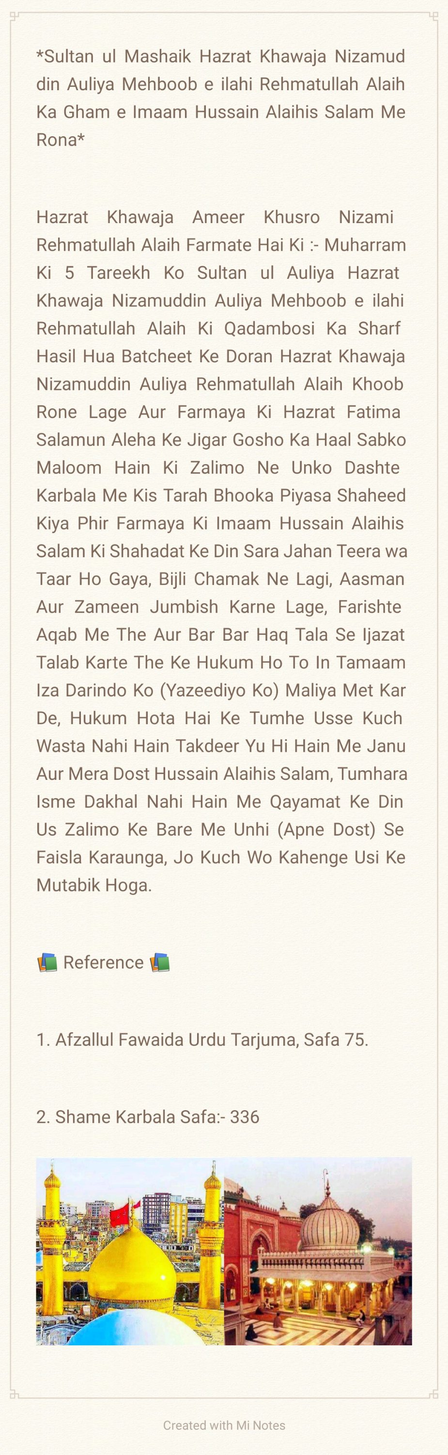 *Aapki Wiladat 5 Shaban ul Muazzam 4 Hijri Mutabik 8 January 626 Esvi Baroz Mangal Me Hui, Aapki Shahadat 10 Muharram 61 Hijri Mutabik 10 October 680 Esvi Baroz Juma Hui, Aap Shehansha e Qull Aalam Huzoor Ahmad e Mujtuba Muhammad Mustufa ﷺ Ke Nawase Aur Mola e Kaynat Mola Imaam Ali Alaihis Salam Aur Syyeda e Kaynat Syyeda Fatima Zehra Salam un Aleha Ke Shehzadaye The, Aapki Shan Me Huzoor Alaihis Salam Ne Farmaya:- Hasan Aur Hussain Jannati Jawano Ke Sardar Hain, Hasan Aur Hussain Hi To Mere Gulshane Duniya Ke Phool Hain, Hussain Mujh Se Hain, Me Hussain Se Hu, Jisne Hussain Se Muhabbat Ki Usne Mujh Se Muhabbat Ki, Jisne Hussain Se Bugz Rakha Usne Mujh Se Bugz Rakha, Huzoor Alaihis Salam Aapke Liye Apna Sajda Taweel Fama Diya Karte The, Huzoor Alaihis Salam Aapke Liye Khutba Chor Kar Mimbar Sharif Se Neeche Tashrif Liyaya Karte The, Huzoor Alaihis Salam Apko Apni Dosh Mubarak Par Bedha Kar Sawari Karate The, Aapki Shahadat Ki Khabar Hazrat Jibreel Alaihis Salam Ne Aapke Nana Huzoor Alaihis Salam Ko Aapke Bachpan Me Hi Dedi Thi, Aapne 25 Martaba Paidal Hajj Ada Kiya, Aap Aa’imma e Ahle Baith Ke Teesre Imaam Hain, Aap 28 Rajab 60 Hijri Ko Madina Pak Ko Chora, 8 Zilhijja Ko Aapne Makka Sharif Ko Chora Aur Karbala Sharif Ki Taraf Rawana Hue, 2 Muharram 61 Hijri Ko Aap Karbala Sharif Pouche, 7 Muharram Ko Yazeedi Foj Ne Apke Qafile Ka Pani Band Kar Diya, Aur 10 Muharram Ko Aapko Badi Hi Bedardi Ke Sath Shaheed Kar Diya, Aapke Sath Karbala e Mualla Me 72 Shohada Shaheed Hue, Jinme Mashoor Aapke Bhai Hazrat Ghazi Abbas Alamdar, Aapke Shezade Hum Shakle Paighambar Hazrat Ali Akbar, Aapke Shezadaye Hazrat Ali Asghar, Aapke Bahanje Hazrat Aun, Hazrat Muhammad, Aapke Bhatije Hazrat Qasim, Aapke Bachpan Ke Dost Hazrat Habeeb Ibne Mazahir Alaihimus Salam Ye Sab Hazraat Shaheed Hue, Mola Imaam Hussain Alaihis Salam Ki Shahadat Ke Bad Jab Yazeedi Foj Ne Apke Sar Mubarak Ko Neze Par Buland Kiya To Apne Neze Par Bhi Quran Sharif Ki Tilawat Farmayi, Aapki Shahadat Ke Din Suraj Girhan Me Aa Gya, Aapki Shahadat Ke Din Se 6 Mah Tak Aasman Ke Kinare Surkh Rahe Bad Me Rafta Rafta Wo Surkhi Jati Rahi, Albatta Afaq Ki Surkhi Jisko Shafaq Kha Jata Hain Aaj Tak Mojood Hain Ye Surkhi Shahadat e Imaam Hussain Se Pehle Mojood Na Thi, Aapka Mazar Mubarak Karbala Sharif, Iraq Me Marjai Khaliak Hain…*