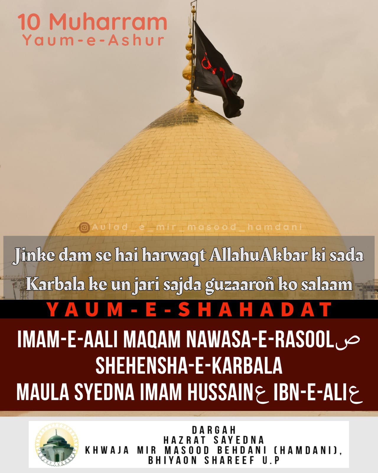 *Shaheed e Aazam Sayyed ush Shohada Sayyed ush Shabaabi Ahlil Jannah Sultan e Karbala Syed ul Mazloomeen Imaam e Aali’maqaam Imaam e Hammam Imaam e Arsh Maqaam Imaam e Tishna Kaam Hazrat Syedna Sarkar Mola Imaam Hussain Alaihis Salam*
