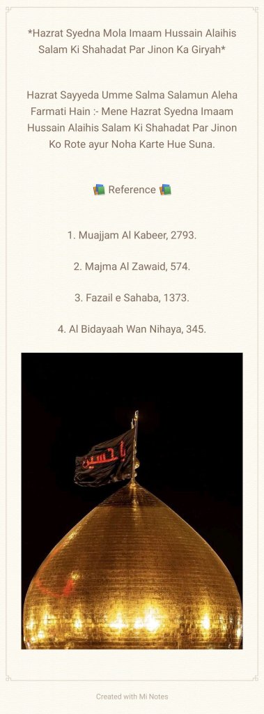 “Imam Hussain Alaihisalaam Maidan-e-Karbala me Aaye to 25000 tirandazo ne teer chalaye kai hazaro ne talwar chalayi. shimr lanati ne Aapko bahot taklif di. Furaat ka paani band kardiya gaya, har chain o sukoon cheen liya gaya. Hazaro takleef aur musibaten aayi. Ek ke baad Ek Imam Ali Akbar, Imam Ali Asgar, Imam Qasim Ibne Imam Hasan (Alaihi-Mussalam) Shaheed kardiye gaye. Aapne Gulshan-e-Risalat ke Phoolon ko Qurban hote dekha. Aapne Unko Zinda rawana kiya par Laasho ko wapas Kheme me laaye. Aapne har aafat aur takleef dekhi par fir bhi Muskurate rahe (yaani Allah Ta’ala ki Raza me Raazi rahe) aur Aapke Qadmain Shareefain nahi dagmagaaye.
