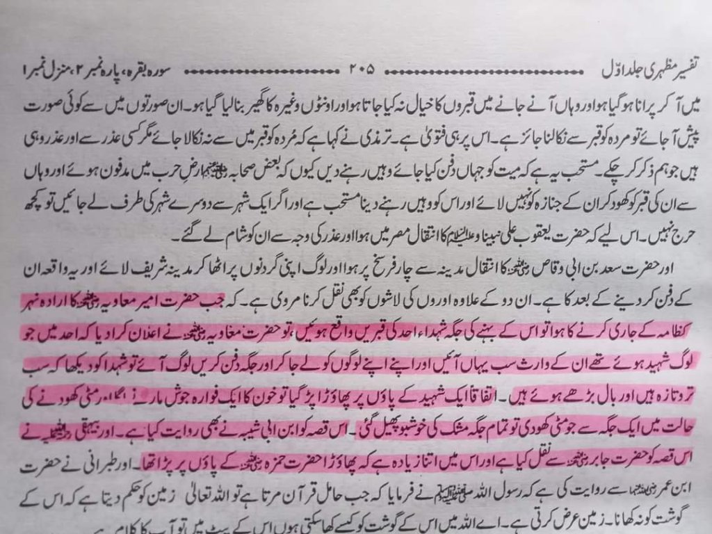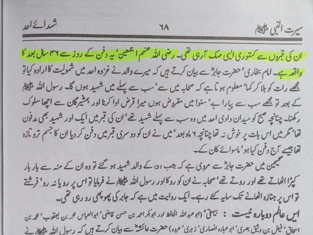जब शोहदा-ए-किराम के कब्रिस्तान को खोदा गया तो नबी करीम सल्ल० के चचा सय्यद-उस-शोहदा हजरत अमीर हमज़ा रजिअल्लाह अन्हु के जिस्म पर फावड़ा लग गया जिससे हजरत अमीर हमज़ा रजिअल्लाह अन्हु के जिस्म से ताजा खून निकलने लगा और चारो ओर एक खुश्बू सा फैल गया।