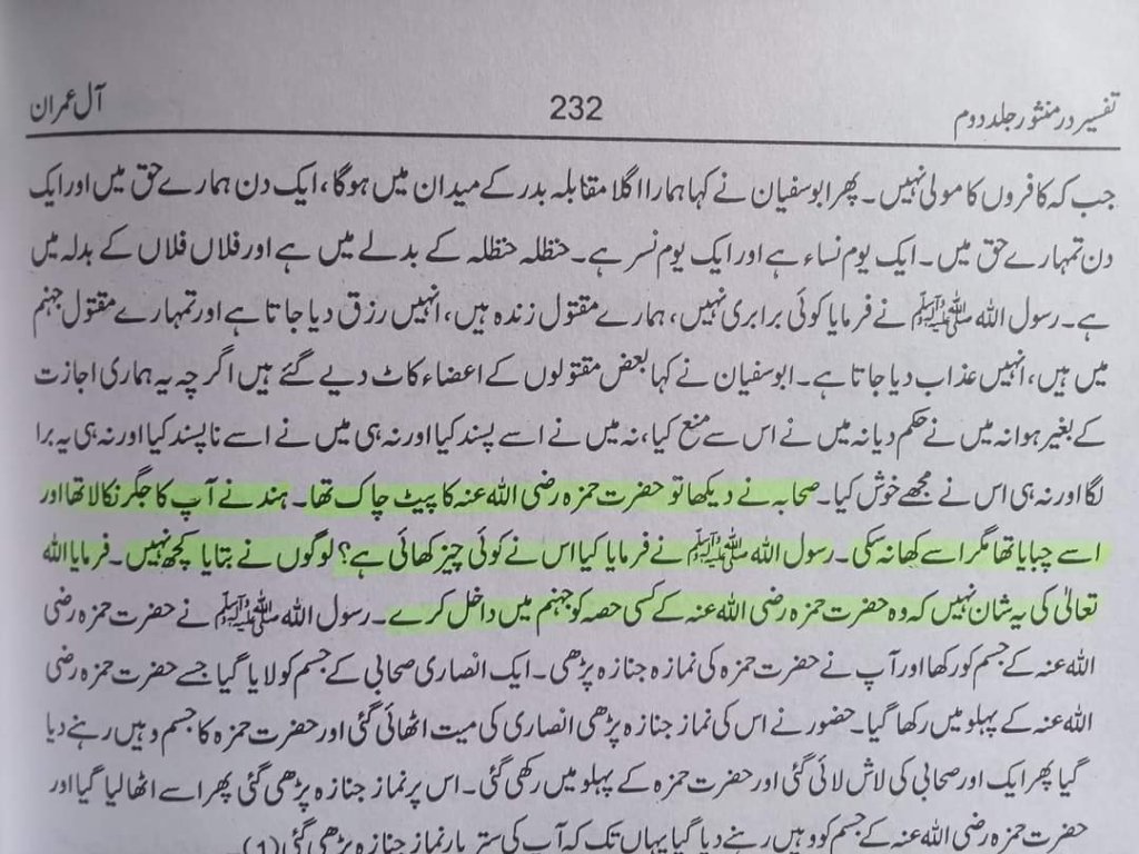 माविया की इख्तिलाफी बाप अबू सुफियान ने जंगे ओहद में नबी करीम सल्ल० से जंग की और जंगे ओहद में नबी करीम सल्ल० के चचा सय्यद-उस-शोहदा हजरत अमीर हमज़ा रजिअल्लाह अन्हु को अबू सुफियान ने शहीद कर दिया और माविया की मां हिंदा ने सय्यद-उस-शोहदा हजरत अमीर हमज़ा रजिअल्लाह अन्हु के नाक-कान और उंगलियों को काटकर हार बनाकर अपने गले में पहन लिया और पेट फाड़कर कलेजा निकालकर अपने मुंह में रखकर कि इसे निगल जाएं मगर वो निगल ना सकी इसलिए इमाम जलालुद्दीन श्यूती की तफसीर ए दुर्रे मंसूर में और तफसीर ए इब्ने कसीर में है कि नबी करीम सल्ल० ने फ़रमाया कि जानते हो कि हिंदा ने हमारे चचा सय्यद-उस-शोहदा हजरत अमीर हमज़ा के कलेजे को क्युं निगल ना सकी.? क्योंकि अल्लाह नहीं चाहता कि हजरत अमीर हमज़ा रजिअल्लाह अन्हु के किसी भी हिस्से को जहन्नम में दाखिल करे…मतलब हिंदा जहन्नमी है और अल्लाह नहीं चाहता कि हजरत हमजा का कोई हिस्सा इस जहन्नमी हिंदा के पेट में चला जाए।