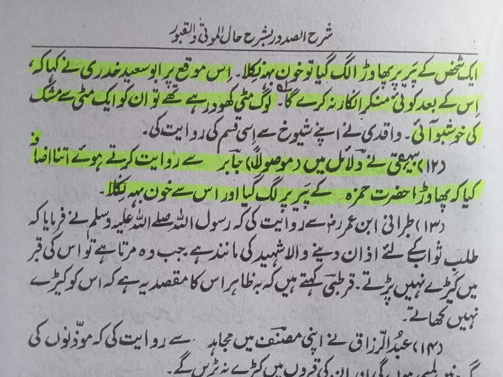 इमाम जलालुद्दीन श्यूती ने कब्र के हालात में, इमाम इब्ने जरीर तबरी ने तारीख ए तबरी में, इमाम इब्ने कसीर ने सीरतुन्नबी में, इमाम बैहकी ने दलाएल-उन-नबूवत में और कारी सनाउल्लाह पानीपती हनफी ने तफसीर ए मज़हरी में और बहुत सी किताबों में लिखा है कि-