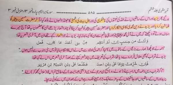 फिर आगे क़ाज़ी सनाउल्लाह पानीपती लिखते हैं कि- “मैं कहता हूं कि बनी उमय्या को हालते कुफ्र में मजे उड़ानें का मौका दिया गया, यहां तक कि अबू सुफियान, माविया और अम्र बिन आस वगैरह मुसलमान हो गयें फिर यजीद और इसके साथियों ने अल्लाह की नेमतों की नाशुक्री की और अहले-बैत की दुश्मनी का झंडा इन्होंने बुलंद किया, आखिर हज़रत ईमाम हुसैन को जुल्मन शहीद कर दिया और हजरत ईमाम हुसैन को शहीद कर चुका तो चंद अशआर (शेर) पढ़ें जिनका मजमून ये था “आज मेरे असलाफ (यानि पूर्वज या बाप-दादा) होते तो देखते कि मैंने आले मुहम्मद और बनी हाशिम से उनका कैसा बदला लिया।” *लानत बर यज़ीद और उसके पैरोकार पर*