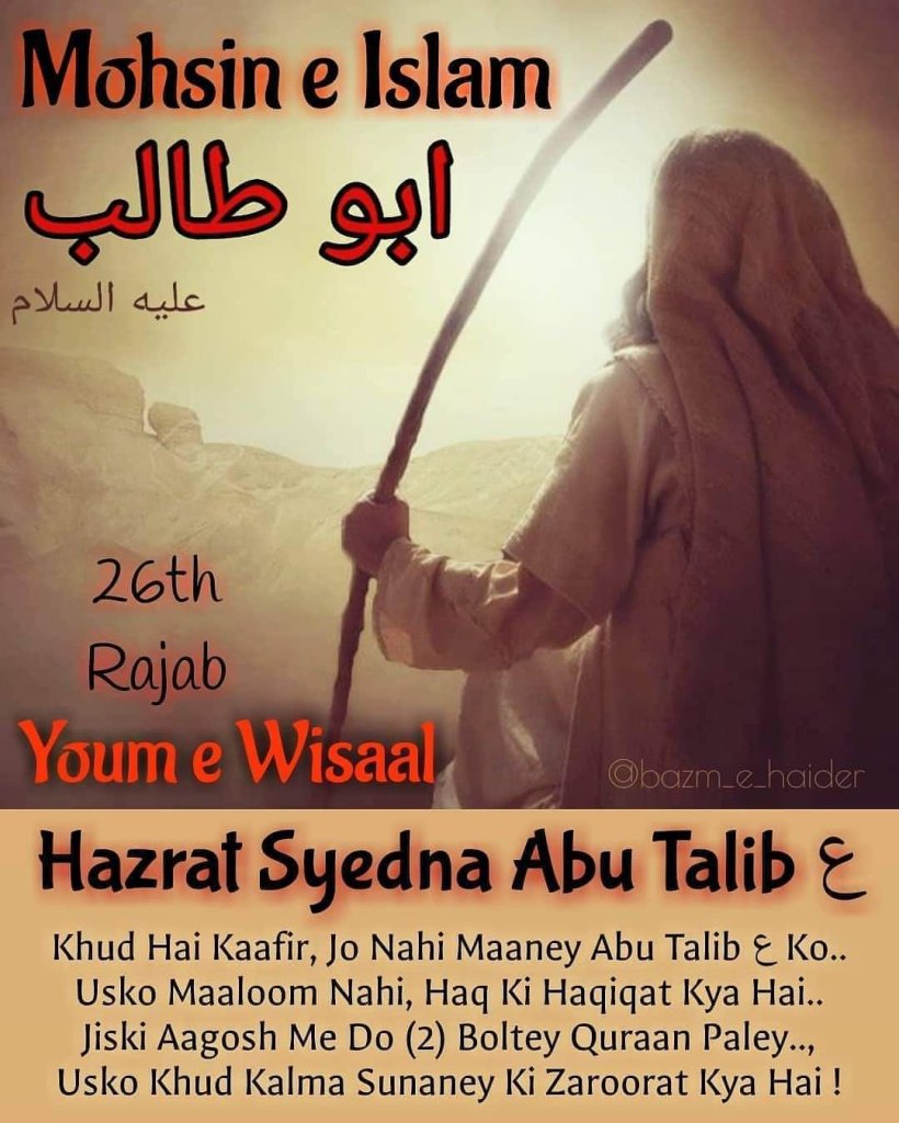 *Aapki Wiladat 29 Shawwal ul Mukarram 540 Esvi Me Makkah Sharif, Saudia Arabia Me Hui, Aapka Wisaal 26 Rajab ul Murajjab 619 Esvi Me Hua, Aap Sarkar Do Aalam Huzoor Ahmad e Mujtuba Muhammad Mustafa ﷺ Ke Chacha Jaan, Mola e Kaynat Mola Imaam Ali Alaihis Salam Ke Walid e Majid, Hazrat Syedna Mola Imaam Hasan Alaihis Salam Hazrat Syedna Mola Imaam Hussain Alaihis Salam Ke Dada Jaan The, Aapne Huzoor ﷺ Ki Bachpan Se Jawani Tak Parwarish Ki, Huzoor ﷺ Ka Sayyeda Khadija tul Kubra Salamun Aleha Se Nikah Hazrat Abu Talib Ne Padhaya Aur Mehar Apni Jeb Se Ada Kiya, Aapne Huzoor ﷺ Ke Bachpan Se Lekar Aelane Nabuwat Ke Bad Bhi Apne Wisaal Ke Din Tak Huzoor ﷺ Ki Kuffar Aur Mushrikeen Se Hifazat Kari Aur Unke ilzamat Se Difa Kiya Aur Fir Aesi Hifazat Ki Ke Jab Kuffar Ne Boycott Kiya To Har Raat Huzoor ﷺ Ke Bistar Par Apne Sahabzade Hazrat Syedna Mola Imaam Ali Ko Sulaya Taake Koi Badbkaht Hamla Kare To Unk Sahabzade Mola Ali Shaheed Ho Magar Huzoor ﷺ Ko Koi Taklif Na Pouche, Aap Duniya Ke Sabse Bade Muhibbe Rasool Hain, Aap Duniya Ke Sabse Pehle Naat Khuwan Hain, Jab Hazrat Abu Talib Ka Wisaal Hua To Huzoor ﷺ Ne Us Pure Saal Ko Gham Ka Saal Karaar Diya Itna Gham Hua Aapko Hazrat Abu Talib Ki Judayi Ka, Aapka Mazar Mubarak Makkah Sharif, Saudia Arabia Me Marjai Khaliak Hain…*