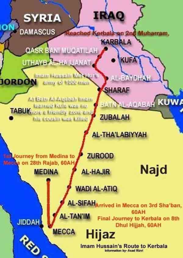 हज़रत इमाम हुसैन अस ने परिस्थिति को देखकर मदीना छोड़ने का निश्चय कर लिया. हुसैन अपने घराने वालों के साथ मदीने से मक्का रवाना हुए. पहले वह मक्के गये मगर वहाँ भी यज़ीद के लोग मौजूद थे जो चाहते थे कि हज के अवसर पर चुपके से इमाम हुसैन को शहीद कर दे और अपराध किसी और , के सिर मढ़ दिया जाये. मगर हुसैन तो यह चाहते थे कि जान इस तरह दें कि दुनिया को अच्छी तरह मालूँम हो जाय कि हुसैन ने क्यों जान दी, और किसने उनको क़त्ल किया? इसलिए आप हज किये बिना ईराक की तरफ़ रवाना हो गये. ये छोटा सा क़ाफ़िला अरब की गर्मी की कठिन यात्रा के दुख झेलता हुआ चला जा रहा था. हर मंज़िल पर लोग हुसैन से आग्रह करते थे कि ख़ुदा के लिए वापिस चले जाइये, यज़ीद की शक्ति बहुत बड़ी है और उनकी सहस्त्रों की संख्या में सेनाएँ जमा हो रही हैं. मगर हुसैन मुहम्मद के नवासे और अली के बेटे थे, जिन्होने ख़ुदा के बताए रास्ते पर चलने के लिए हमेशा ख़ुशी-ख़ुशी दुख झेला था, वे अपने इरादे में अटल रहे और यात्रा की कठनाइयाँ सहन करते हुए कूफा की तरफ आगे बढ़ते रहे. शहादत ५७(56 साल 5 महीने और 5 दिन) साल के भूखे प्यासे इमाम हुसैन (ए.स) ,सभी को लेके खेमे (तम्बू) मैं ले आते थे.इनमें से किसी का भी जिस्म पूरा ना आया खेमे मैं. यह इतिहास की ऐसी शोकपूर्ण घटना है कि जिसकी यादें साढ़े तेरह सौ वर्ष से सभी मजहबों के लोग मनाते हैं.