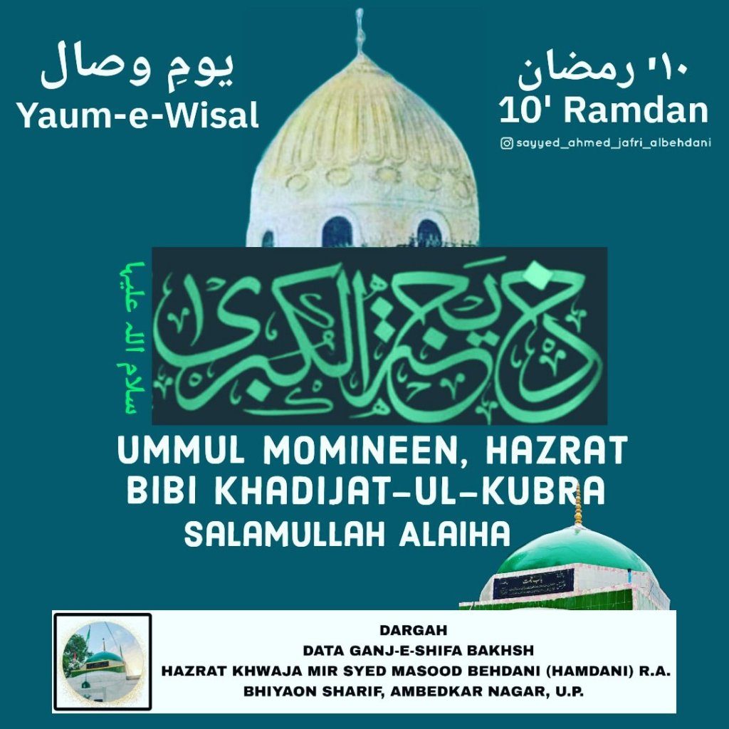 *Aapki Wiladat 555 Esvi Me Hui, Aapka Wisaal 10 Ramzan ul Mubarak 10 Nabawi Mutabik 619 Esvi Me Hua, Aap Shehansha e Qull Huzoor Ahmad e Mujtuba Muhammad Mustafa ﷺ Ki Pehli Zauja e Mohtarma Sayyeda e Kaynat Syyeda Fatima Zehra Salamullah Alaiha Ki Walida Majida Aur Hazraat e Hasnain Karimain Alaihimus Salam Ki Nani Jan Thi, Aapke Damad Ameer ul Momineen Hazrat Mola Imaam Ali Alaihis Salam Aur Ameer ul Momineen Hazrat Sayyedna Usman Ghani Razi Allahu Tala Anhu Hain, 595 Esvi Me Huzoor ﷺ Ne 4 Miskaal Sona Maher Ke Ewaz Me Aapse Nikah Farmaya, Khutba e Nikah Mohsin e Islaam Hazrat Sayyedna Imran Abu Talib Alaihis Salam Ne Padha, Huzoor ﷺ Aapse Bhut Zada Muhabbat Farmate The, Aapki Hayaat Me Huzoor ﷺ Ne Kisi Dusri Aurat Se Nikah Nahi Kiya, Hazrat Sayyedna Ibrahim Razi Allahu Tala Anhu Ke Alawa Huzoor ﷺ Ki Tamaam Aulad Aapse Hi Hain, Huzoor ﷺ Ne Aapki Shan Me Farmaya:- Jis Tarha Apne Zamane Ki Behtareen Aurat Maryam Hain, (Hazrat Sayyedna Isa Alaihis Salam Ki Walida Majida) Aur Apne Zamane Ki Behtareen Aurat Khadija Hain, Aapne Aurto Me Sabse Pehle Islaam Apnaya Aur Huzoor Alaihis Salam Ke Sath Namaz Padhna Aur Ibadat Karna Shuru Kiya, Jab Ahle Makkah Ne Huzoor ﷺ Ki Mukhalifat Karna Shuru Kiya Tab Aap Har Haal Me Huzoor ﷺ Ke Saath Rahi Aur Hosla Deti Rahi, Aapka Is Ummat Par Aesa Ehsan Hain Jo Koi Ada Nahi Kar Sakta Aapne Sabse Pehle Apna Maal Islaam Ke Liye Kharch Kiya, Aapne Apni Tamaam Milkiyat Huzoor ﷺ Ko Pesh Kar Di Thi, Khud Allah Kareem Aur Hazrat Jibrael Alahis Salam Aap Par Apna Salaam Bhejte Hain, Jis Saal Aapka Wisaal Hua Usi Saal Hazrat Syedna Abu Talib Alaihis Salam Ka Bhi Wisaal Hua Tha, Huzoor ﷺ Ko Aap Dono Ke Duniya Se Tashrif Le Jane Ka Itna Gum Hua Aapne Us Pure Saal Ko Gum Ka Saal Karar Diya, Aapka Mazar Mubarak Jannat ul Mualla, Makka Mukarrama, Saudia Arabia Me Marjai Khaliak Hain…*