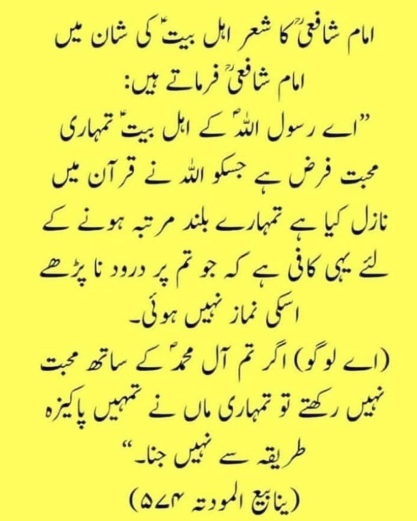 IMAM SHAFAYI (R.A) FARMATE HAIN : “AYE RASOOL ALLAHﷺ KE AHLE BAITع TUMHARI MOHABBAT FARZ HAI JISKO ALLAH NE QURA’N MEIN NAAZIL KIYA HAI TUMHARE BULAND MARTABA HONE KE LIYE YAHI KAAFI HAI KE JO TUM PAR DUROOD NA PADHE USKI NAMAZ NAHI HUI.