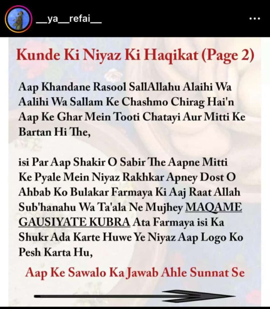 आज मुसलमानों ने हमारे नाना जान की सुन्नत को तर्क कर दिया है हम ने इस नियाज़ को मिट्टी के पियालों में इस लिए ज़रूरी (ज़रूरी से मतलब फर्ज़ या वाज़िब नहीं मक़सद सुन्नत पर अमल करना है) करार दिया ताकि कम से कम साल में एक मर्तबा ही नाना जान की उम्मत मिट्टी के कुंडो में नियाज़ खाकर सुन्नत ए रसूल (صلي الله تعالى عليه وعلى آله وصحبه وسلم) अदा करें।