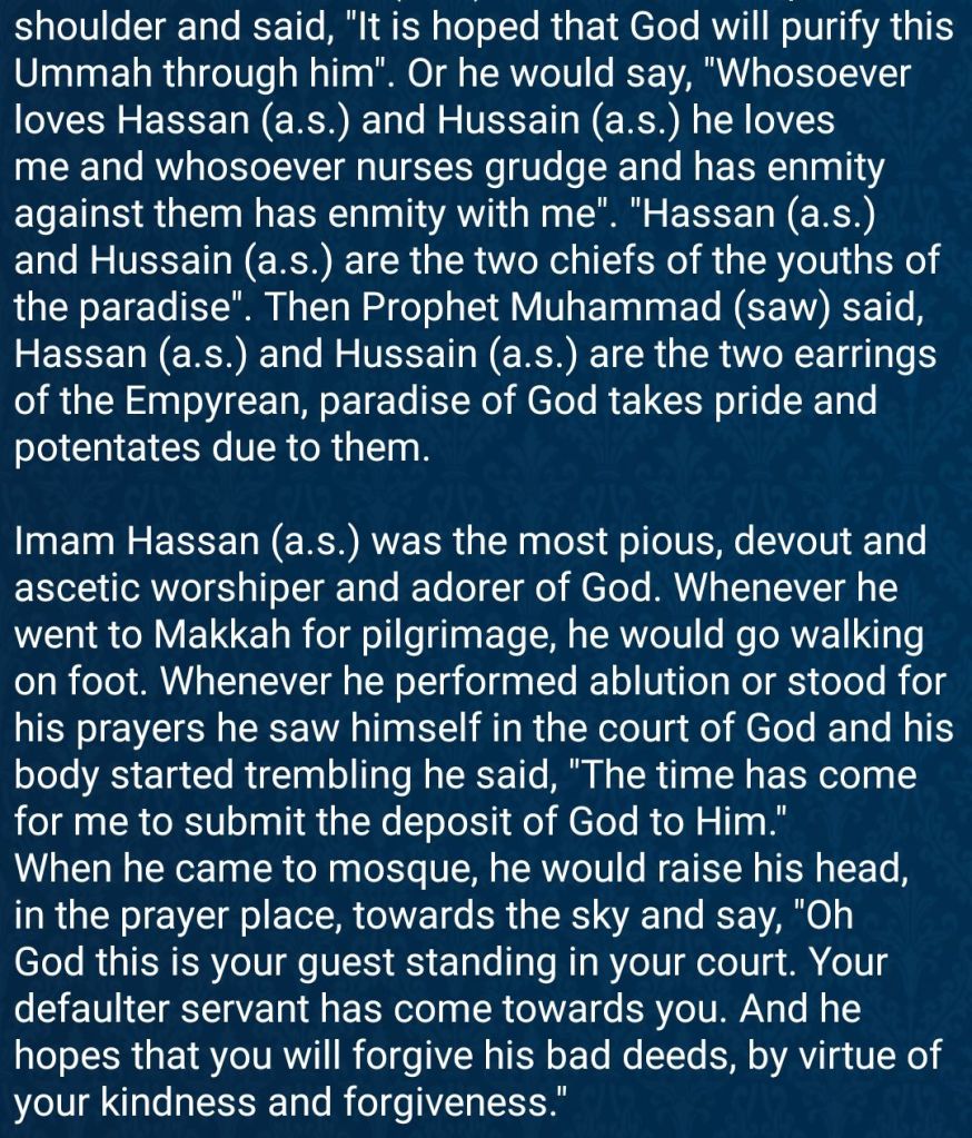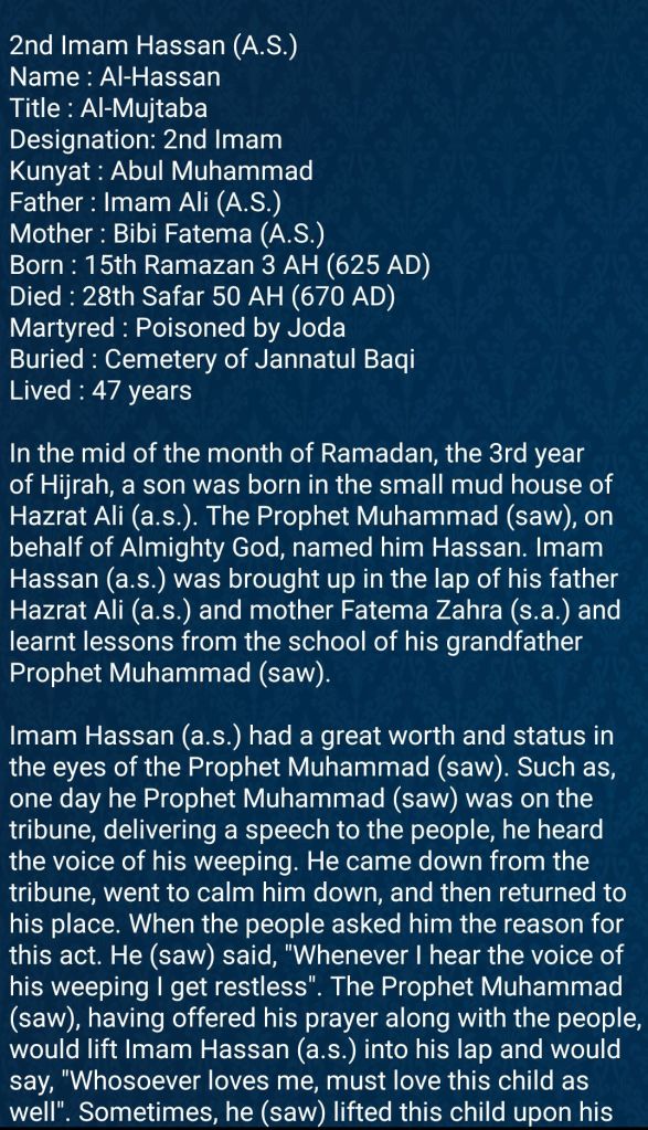 “Imam Hasan Alaihissalam se Muhabbat karo, Unka Naam apne dilme rakho, kyunki jab Allah Ta’ala Apne bando ke dilo me dekhta hai to agar Allah Ta’ala ko uske dilme Apne Mehboob bande ka Naam nazar aata hai to Allah Ta’ala us bande ke saare gunah Apne Mehboob Bande ke Naam ke sadqe se maaf kardeta hai.”