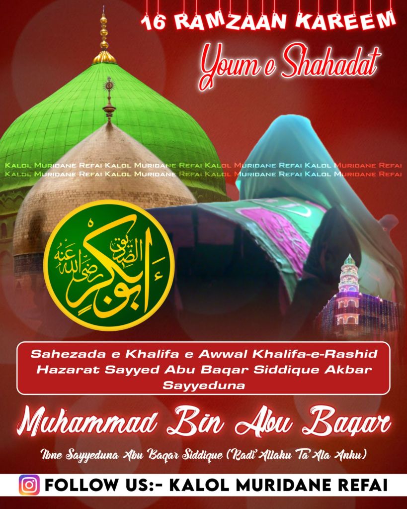 16 Ramzan Sayyeduna Abu Bakr Siddiq RadiAllahu Anhu ke Shehzade, Maula Ali Alaihissalam ke Adopted Bete (Godh liye hue Bete), Sayyeduna Imam Jafar Sadiq Alaihissalam ke Par-Nana, Hazrat Sayyeduna Muhammad bin Abu Bakr RadiAllahu Anhuma ki Shahadat ka Din hai.