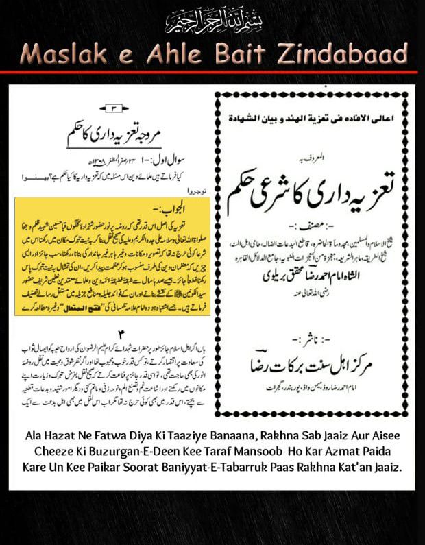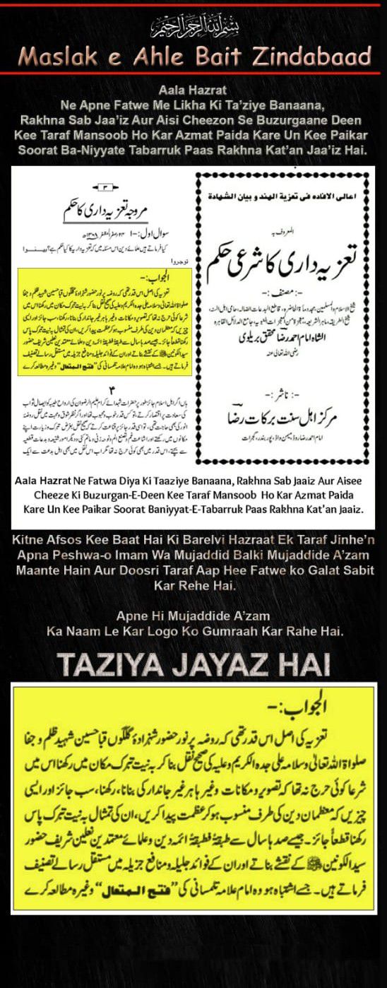 ताज़ियादारी न तो किसी बादशाह के शुरू करने से शुरू हुई है न किसी रज़ा खानी या वहाबी के बंद करने से बंद होगी ये वो रूहानी यादगार और पाकीज़ा अमल या फेल है जिसमे पाक पंजतन का फ़ैज़ शामिल है, जब अहमद रज़ा खान बरेलवी ने रिसाला ताज़ियादारी में लिखा के ताज़िया शिर्क व बिदअत है और ताज़ियादार जहन्नुमी कुत्ते हैं तो हिंदुस्तान ही नहीं दुनिया के तमाम सूफियों के दिल पर इक चोट सी लगी लिहाज़ा उस दौर के एक बहुत बड़े बुजुर्ग हस्ती(जिन से इफ्तेखारिया सिलसिला मनसूब है ) सूफी हज़रत मौलाना इफ्तेखारुलहक़ सुम्मुल कलकतवी र.अ. ने action लेते हुवे किताब जवाज़े ताज़िया तहरीर की जिस में ताज़िया व ताज़ियादारी को तमाम दलीलों से सही व जायज़ साबित कर दिया,जब जवाज़े ताज़िया का अहमद रज़ा खान से जवाब नहीं बन पड़ा तो अपनी तक़रीरों और तहरीरों के ज़रिए हज़रत मौलाना इफ़्तेख़ारुलहक़ र.अ. को भला बुरा कहने लगे यहां तक के बद ज़बानी पर भी उतर आए तब हज़रत मौलान इफ्तेखारुलहक़ र.अ. ने एक किताब तहरीर की जिसका नाम हामिज़ुन असनान है उस किताब में सिर्फ कलमा लाइलाह इल्लल्लाह पर 79 सवाल किये और सफ़हये अव्वल पर लिखा के ख़सुसन(ख़ास तौर से) अहमद रज़ा खान बरेलवी और अमूमन( आम तौर से ) दुनिया के तमाम ओलेमा अगर इल्म रखते हैं तो मेरे सवालों का जवाब दें अगर जवाब न बन पड़े तो आइंदा किसी सूफी से उलझने की कोशिश ना करें जब किताब मन्ज़रे आम पर आई तो अहमद रज़ा खान के साथ सभी मसलक के ओलेमा को सांप सूंघ गेया न किसी से जवाब बन पड़ा और ना ही किसी ने जवाब दिया अहमद रज़ा खान का सारा इल्म धरा का धरा रह गेया अगर रज़ा खानियों को लगता है के जवाब अब भी दिया जा सकता है तो किताब मौजूद है उस वक़्त न सही अब सही.