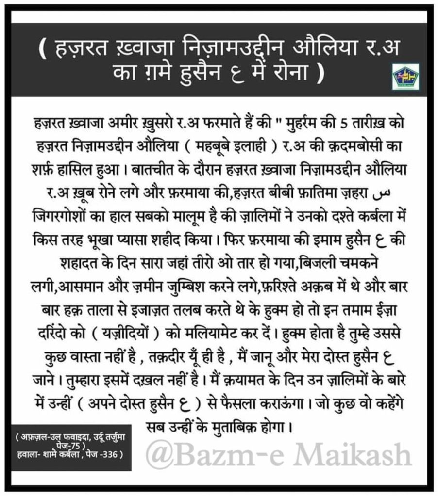 Hazrat Khawaja Ameer Khusro Rehmatullah Alaih Farmate Hai Ki :- Muharram Ki 5 Tareekh Ko Hazrat Khawaja Nizamuddin Auliya Rehmatullah Alaih Ki Qadambosi Ka Sharf Hasil Hua, Bat Cheet Ke Dauran Hazrat Khawaja Nizamuddin Auliya Khoob Rone Lage Aur Farmaya Ki Hazrat Fatima Salamullah Alaiha Ke Jigar Gosho Ka Haal Sabko Maloom Hain Ki Zalimo Ne Unko Dashte Karbala Me Kis Tarah Bhooka Piyasa Shaheed Kiya Phir Farmaya Ki Imaam Hussain Ki Shahadat Ke Din Sara Jahan Teera wa Taar Ho Gaya Bijli Chamak Ne Lagi Aasman Aur Zameen Jumbish Karne Lage Farishte Gazab Me The Aur Bar Bar Allah Ta’ala Se Ijazat Talab Karte The Ke Hukum Ho To In Tamaam Iza Darindo Ko (Yazeediyo Ko) Maliya Met Kar Dein Hukum Hota Hain Ke Tumhe Usse Kuch Wasta Nahi Hain Takdeer Yu Hi Hain Me Janu Aur Mera Dost Hussain Tumhara Isme Dakhal Nahi Hain Me Qayamat Ke Din Un Zalimo Ke Bare Me Unhi (Imaam Hussain) Se Faisla Karaunga Jo Kuch Wo Kahenge Usi Ke Mutabik Hoga.