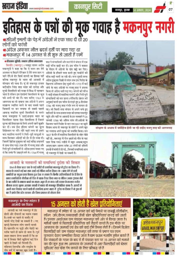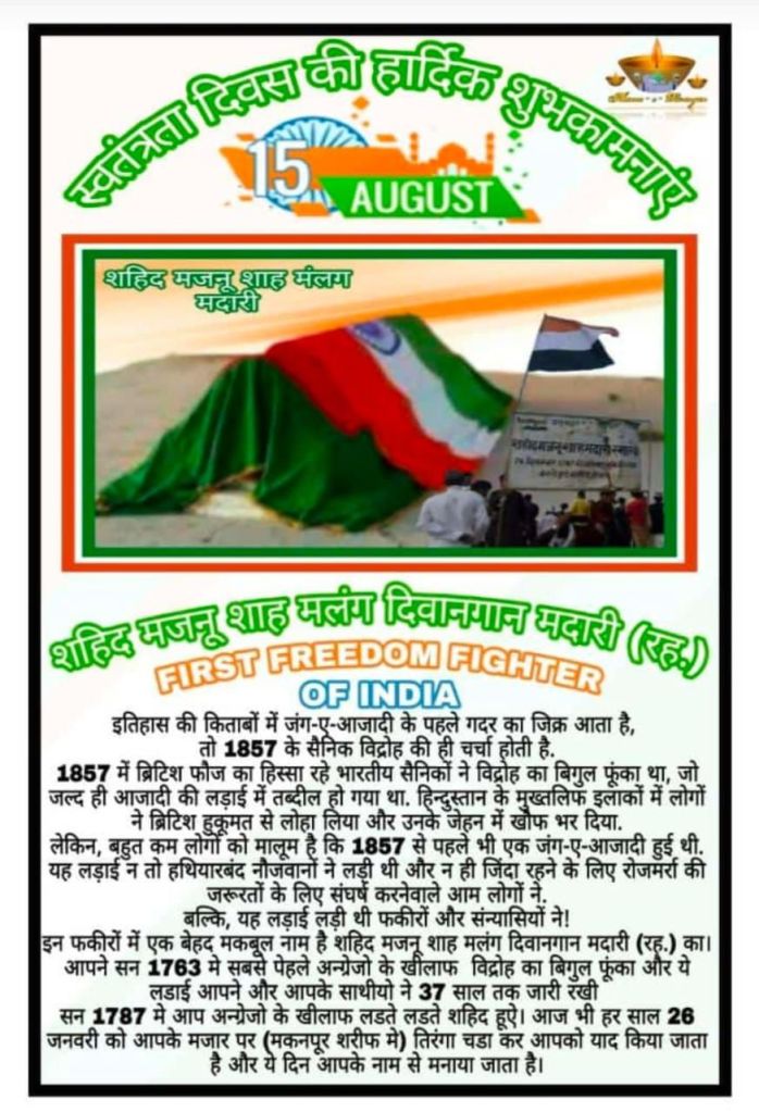हमने इतिहास से संबंधित जिनका *First Freedom fighter* (प्रथम स्वतंत्रता सेनानी) के रूप में जिक्र किया उसमें हज़रत टीपू सुल्तान रह.अलैह का ज़िक्र ज्यादा मिला लेकिन क्या आप लोग जानते हैं कि यह पूर्णतः सत्य नहीं है बल्कि आप तो *Second Freedom fighter of india* हुए हज़रत टीपू सुल्तान से भी पहले जिसने आजादी की लड़ाई शुरू की और आजादी के लिए अपनी आवाज बुलंद की और लोगों को जागरूक किया वह मदारिया सिलसिले के एक अज़ीम बुज़ुर्ग हज़रत मजनू शाह मलंग रह.अलैह है जो सन 1763 ई. में प्रथम स्वतंत्रता सेनानी के रूप में निखरे कई जगहों पर आपका तज़किरा दिखाया या किया गया है जिसमें मशहूर है,