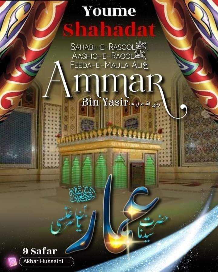 *Aapki Wiladat 570 Esvi Me Makkah Sharif, Saudia Arabia Me Hui, Aapki Shahadat 9 Safar 37 Hijri Mutabik 27 July 657 Esvi Baroz Jumerat Hui, Jo 7 Sahaba Sabse Pehle Imaan Laye Unme Aap Shamil Hain, Huzoor Nabi e Kareem Muhammad Mustufa ﷺ Ne Aapki Shan Me Farmaya :- Yaqeenan Ammar Ibn Yasir Apni Haddiyon Tak Imaan Se Bhare Hue Hain Aur Farmaya Ke Jo Ammar Ka Dushman Hain Allah Uska Dushman Hain, Jo Ammar Se Bughz Rakhega Allah Usse Bughz Rakhega Aur Jo Ammar Ko Bura Bhala Kehta Hain Allah Pak Use Apni Rehmat Se Mehroom Rakhega, Huzoor ﷺ Ne Aapko Aapki Shahadat Ki Khabar Dete Hue Irshad Farmaya Tha Ke Ammar Tujhe Ek Bagi Giroh Qatl Karega Tu Unhe Jannat Ki Taraf Bulayega Wo Tujhe Jahannam Ki Taraf Bulane Wale Honge, Aap Jung e Siffeen Me Maula e Kaynat Hazrat Maula Ali Alaihis Salam Ke Lashkar Me Shamil The Aur Hakim Se Shaam Ke Khilaf Jung Karte Hue Usi Baghi Jahannam Ki Taraf Bulane Wale Giroh Ke Hatho Shaheed Hue, Aapka Mazar Mubarak Ar Raqqah, Syria Me Marjai Khalaik Hain.*