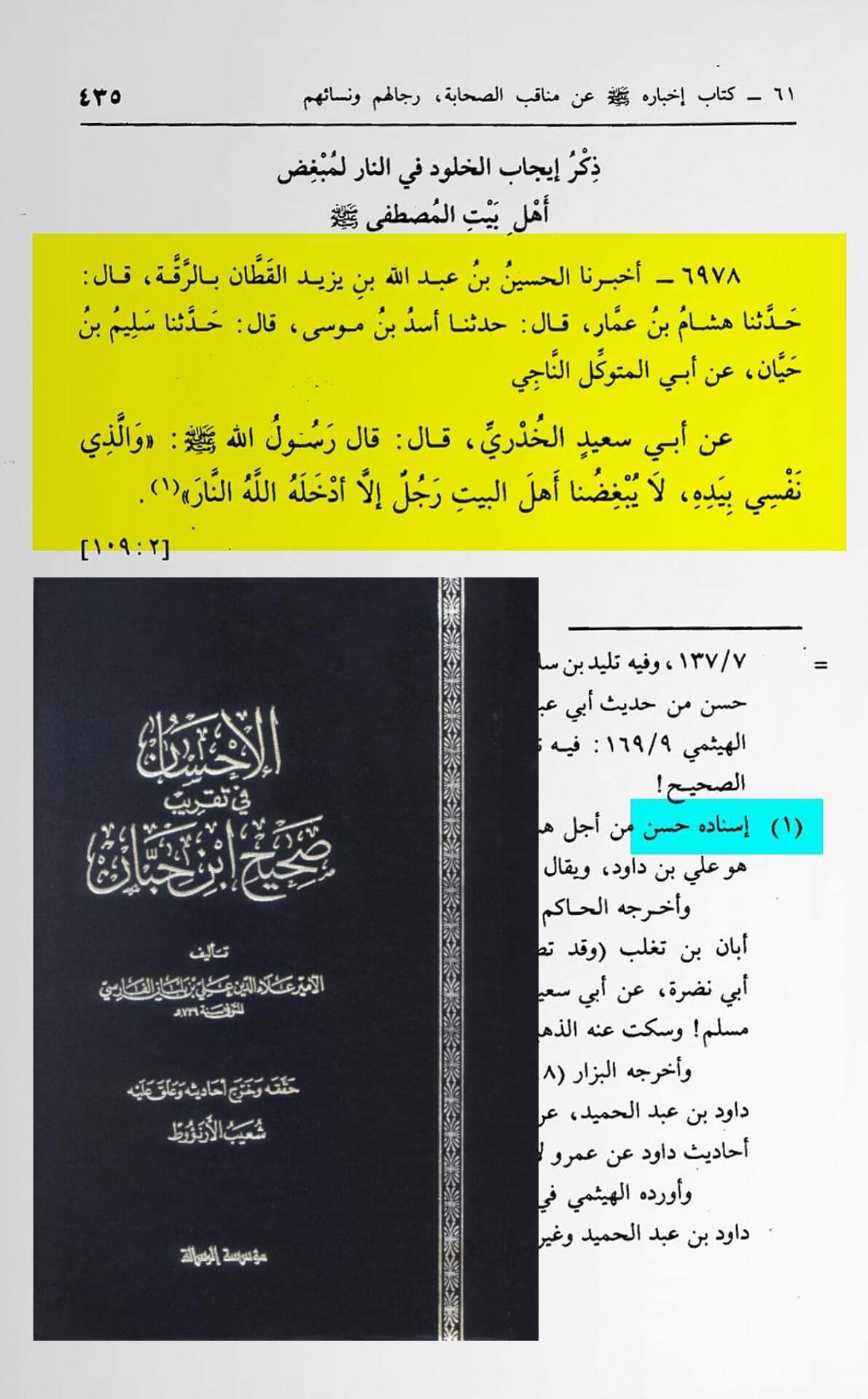 11- जहन्नम में जाने का रास्ता, ऐहलैबयत (عَلَیهِالسَّلام) से नफ़रत करना है। (अल हबीब उल रा सही उल इब्ने हब्बान, सफ़ाह 435)